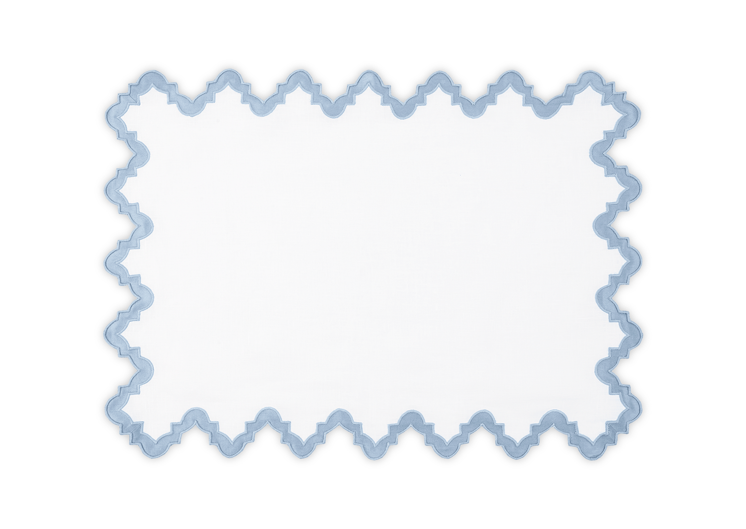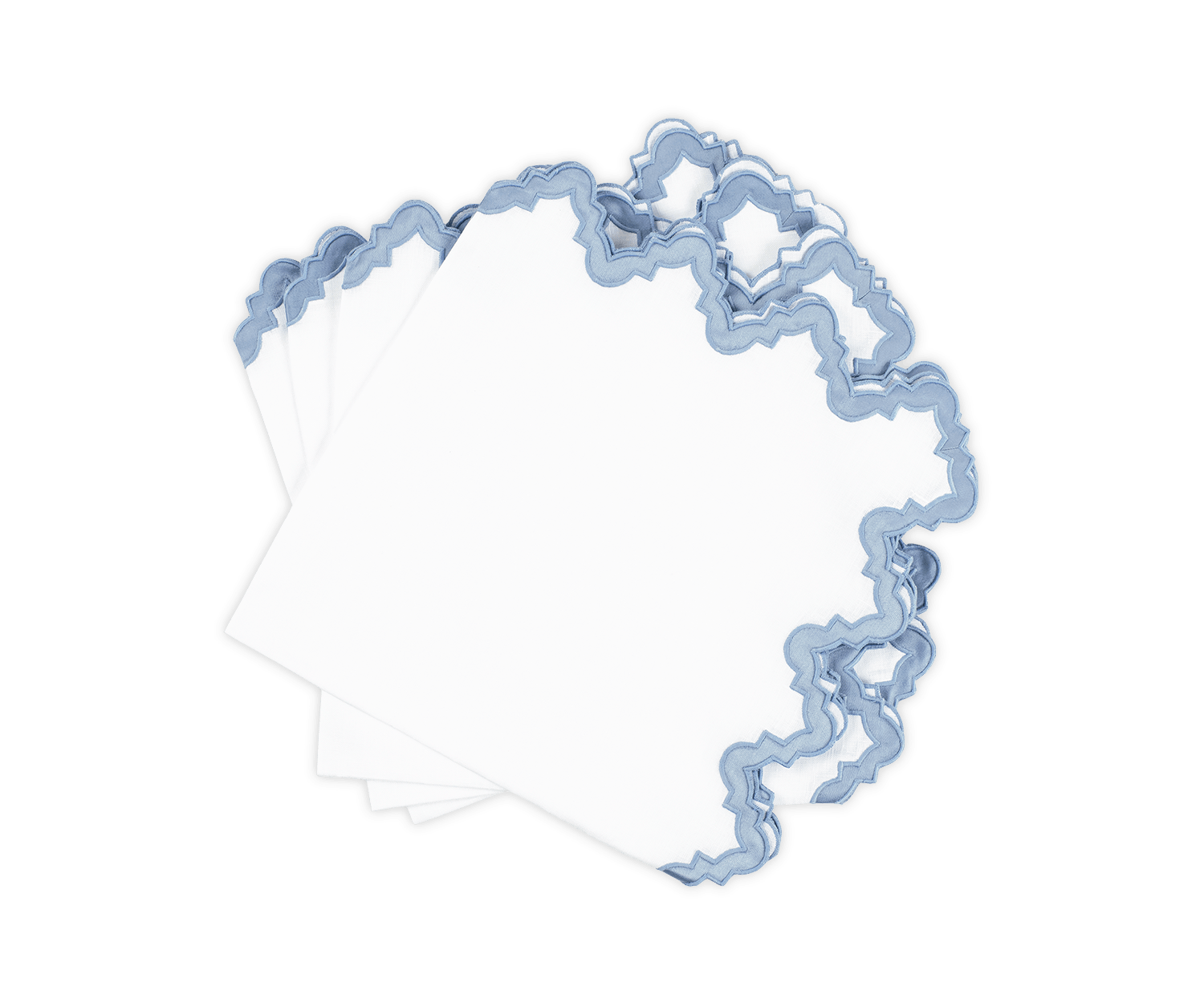 Our signature Aziza applique is now a brilliant border for this new table linen collection. Inspired by the elegant geometry of of Moroccan tiles, Aziza's undulating pattern, cut from our Nocturne sateen and applied on a crisp white linen, is sure to make any well-set table come alive.
