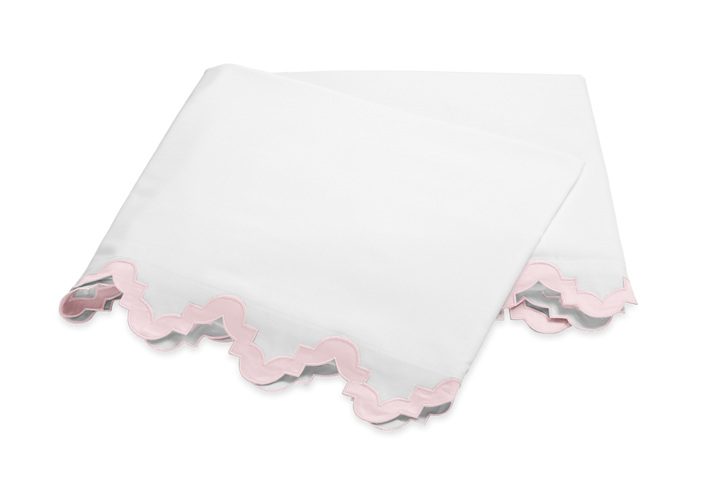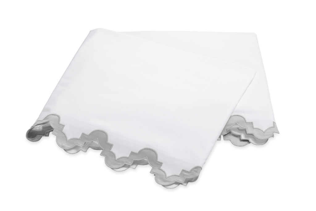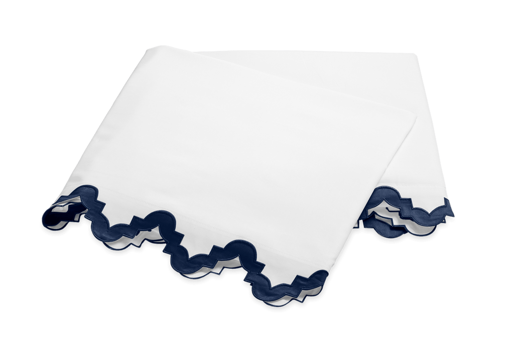 Inspired by the elegant geometry of Moroccan tiles, Aziza (a name that translates to “beloved”) boasts a zig-zag appliqué cut from our Nocturne sateen sewn onto our always popular 600 thread count Milano Egyptian cotton percale sheeting. It’s a slightly exotic, alluring addition to your bedroom.