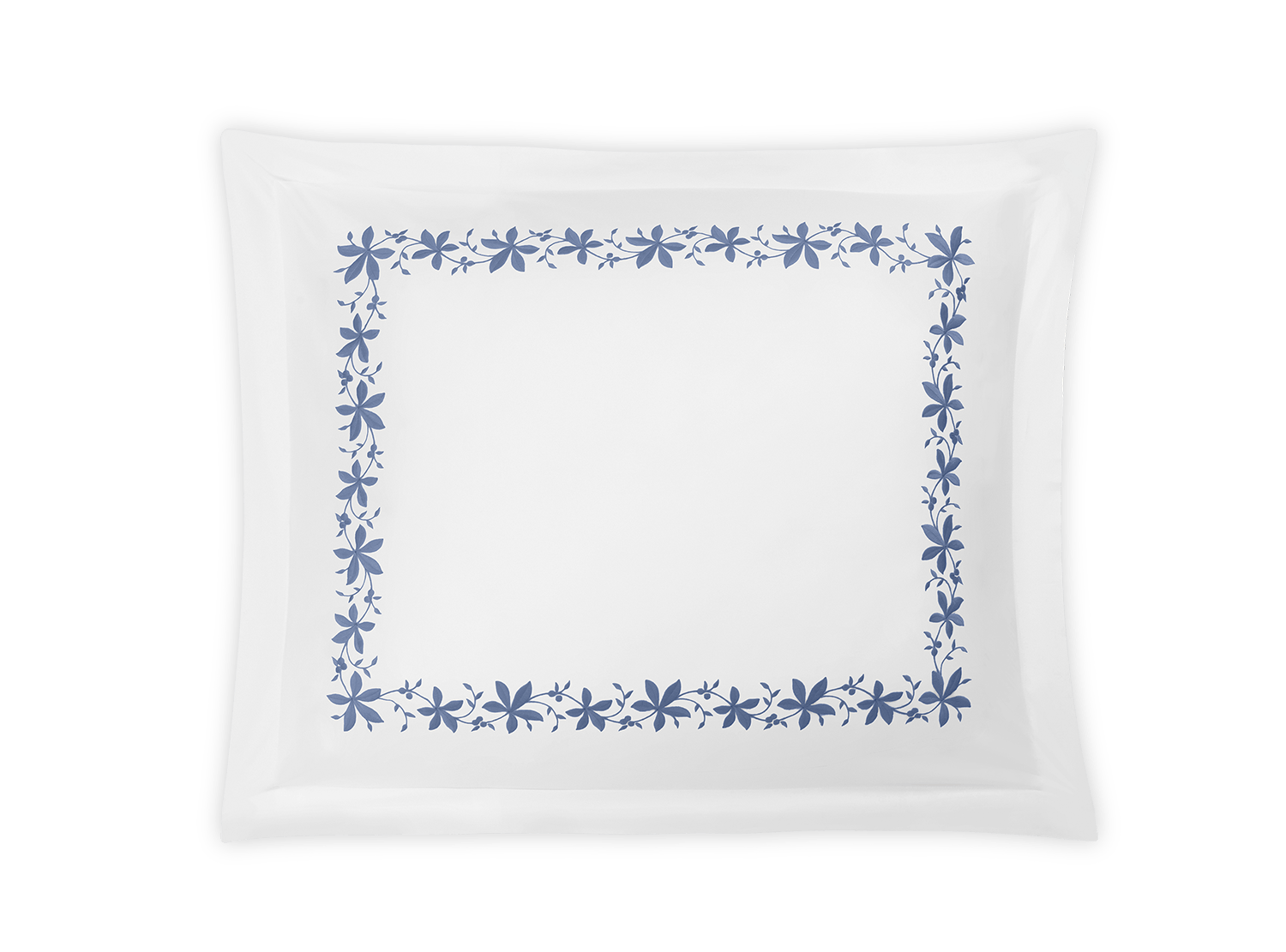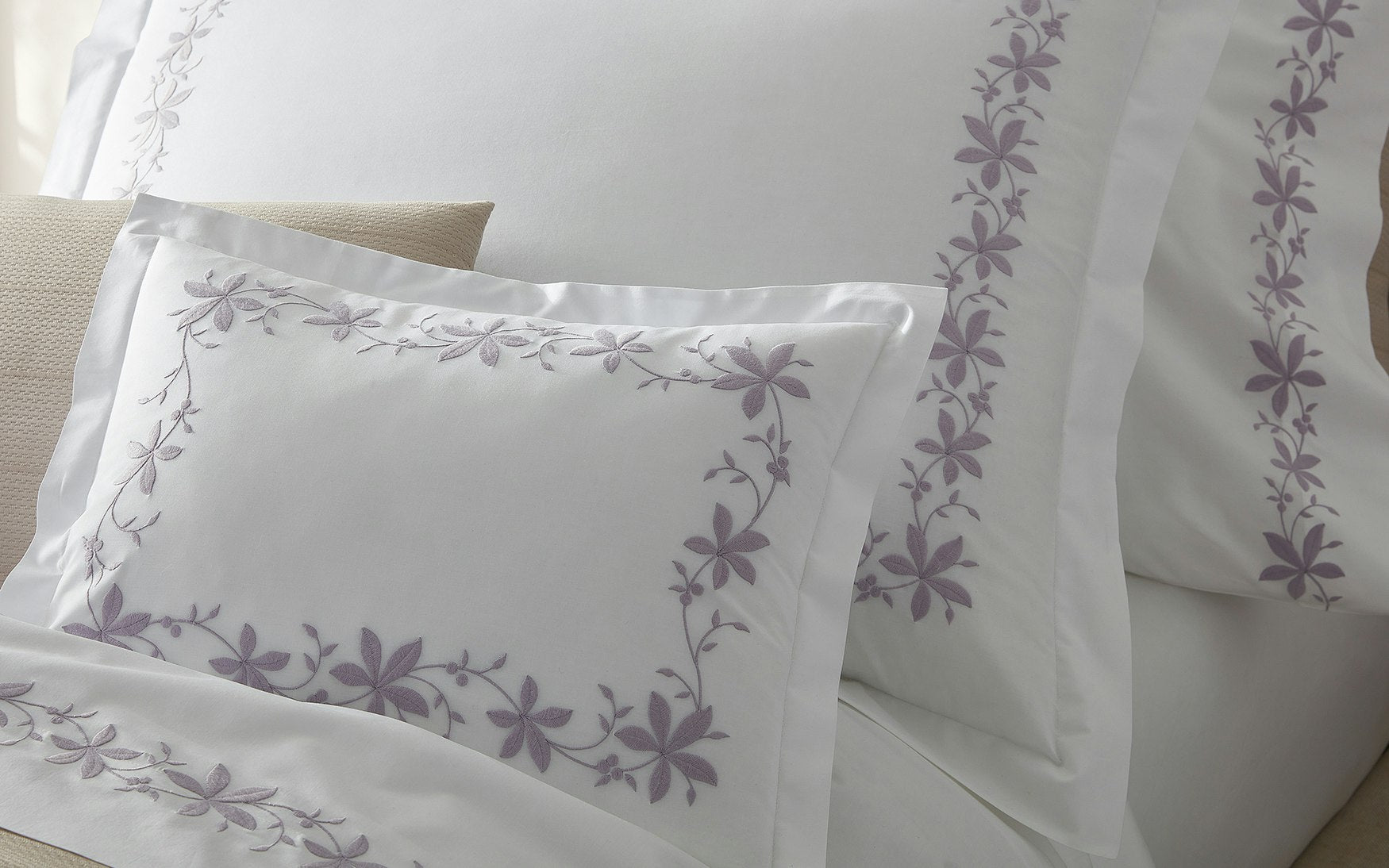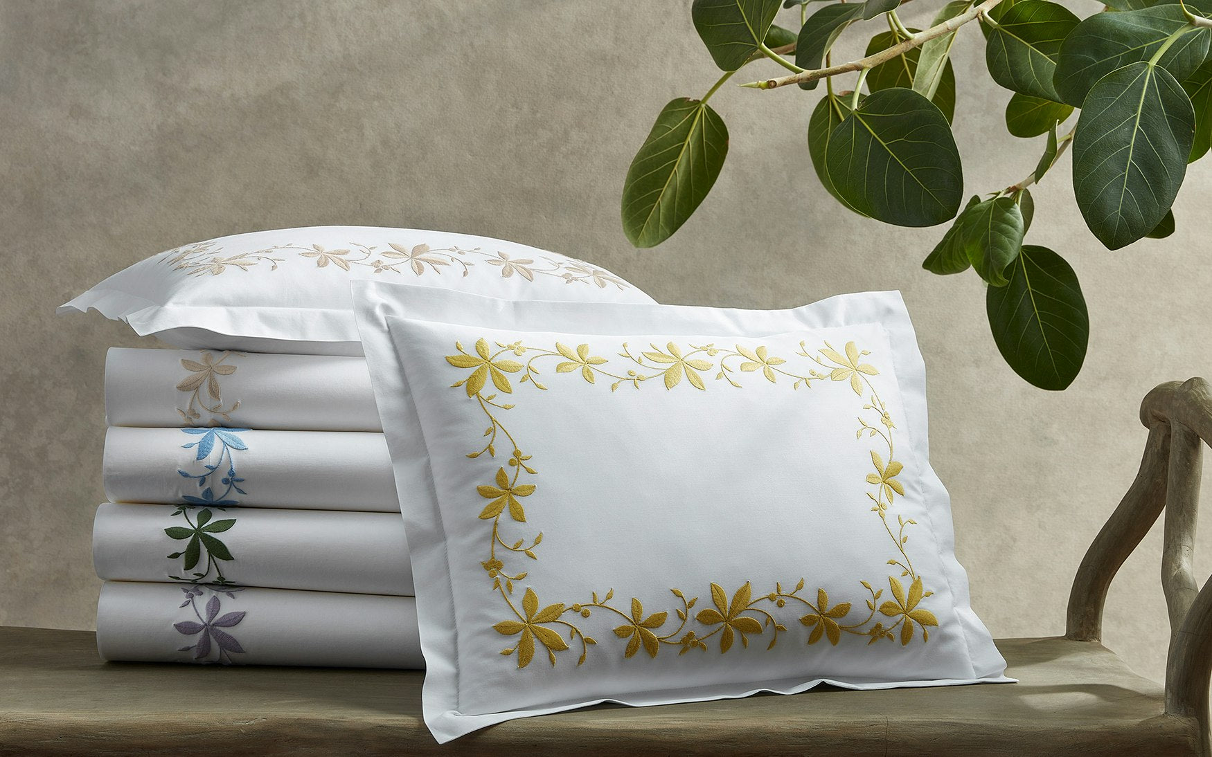 Adorned with a dancing frame of floral vines, Callista is our first decorative embroidery on the silky 500 thread count Bergamo Giza Egyptian cotton percale. With six colors to choose from, Callista adds a pop of character to any room and pairs beautifully with our whimsical Dominique print.
