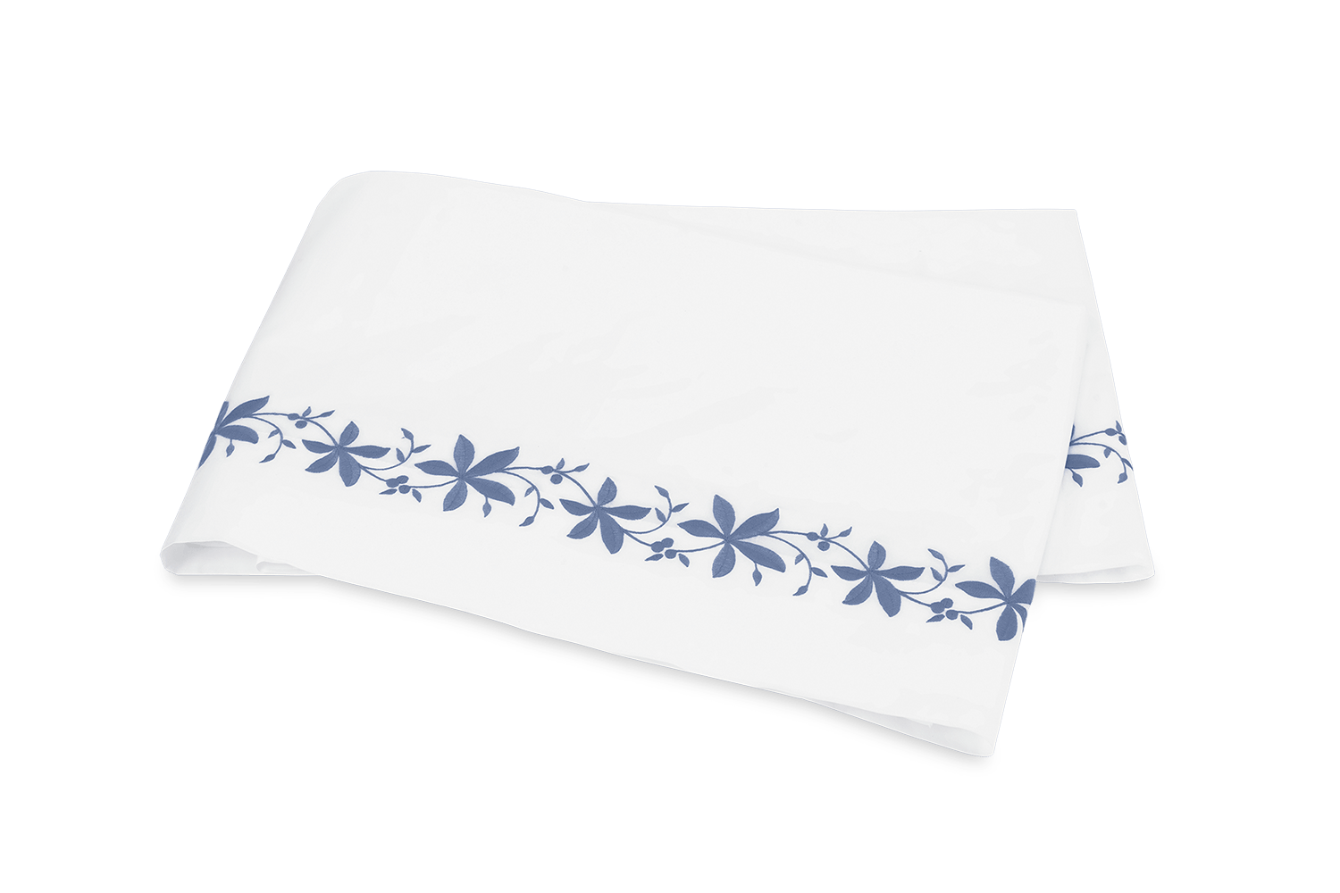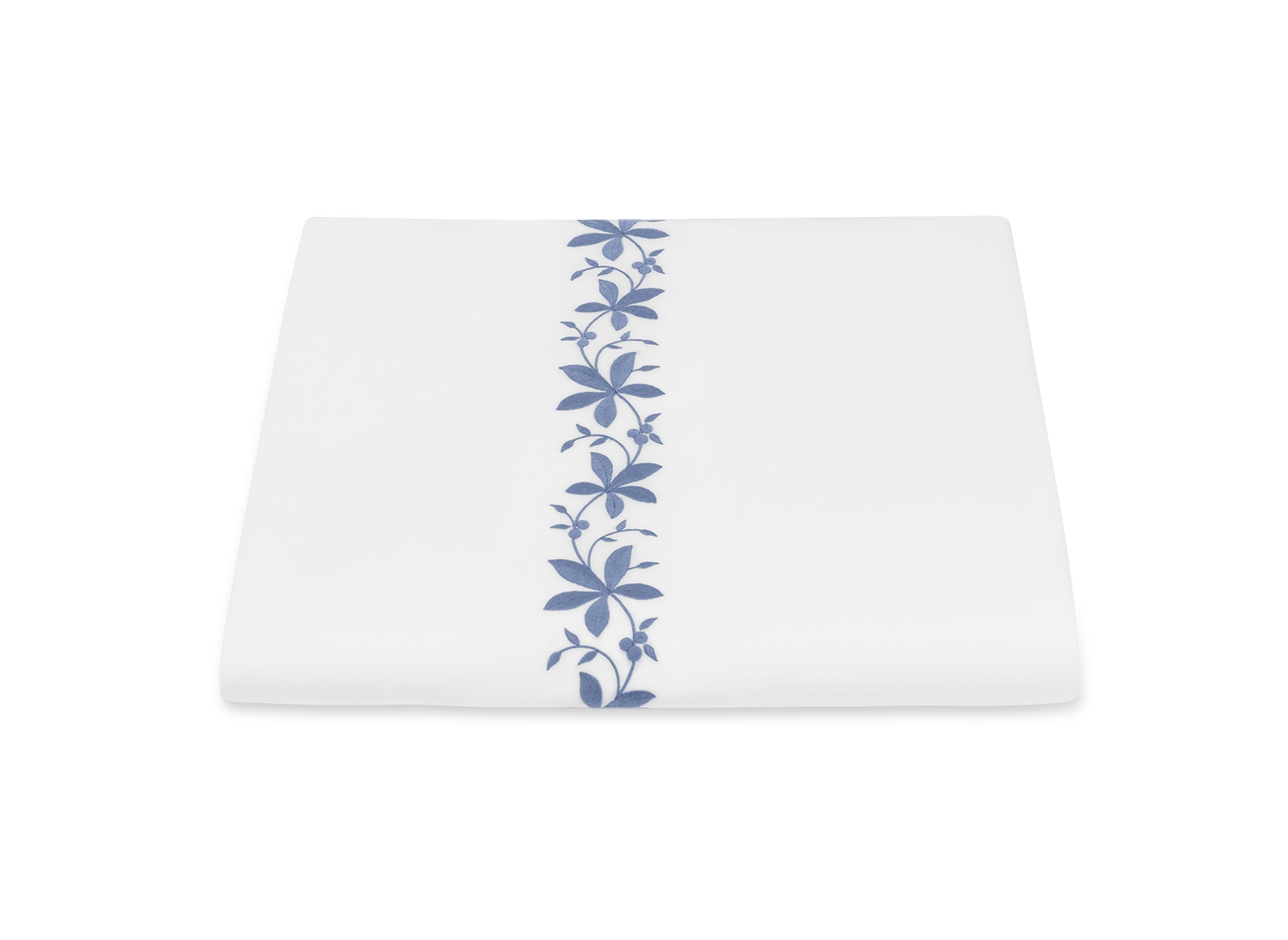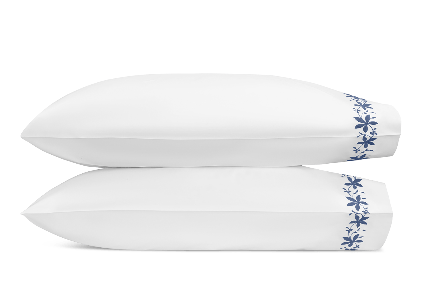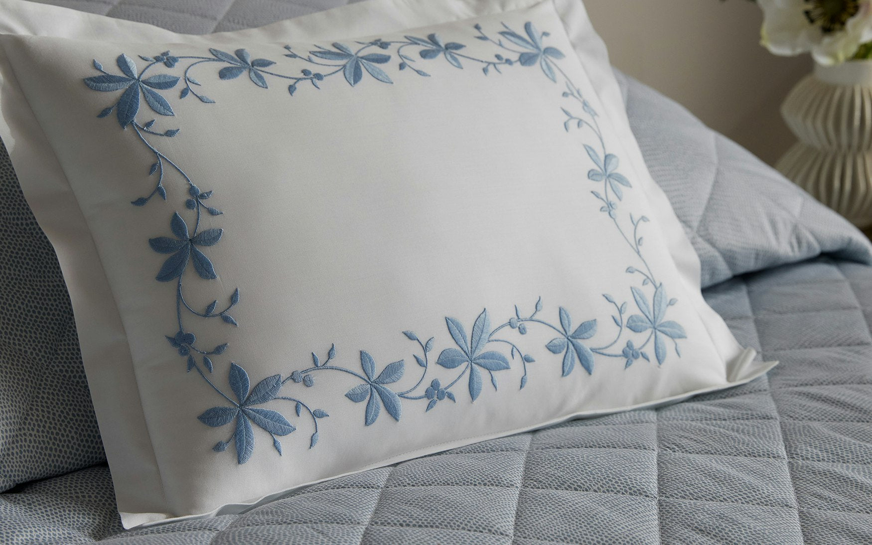 Adorned with a dancing frame of floral vines, Callista is our first decorative embroidery on the silky 500 thread count Bergamo Giza Egyptian cotton percale. With six colors to choose from, Callista adds a pop of character to any room and pairs beautifully with our whimsical Dominique print.