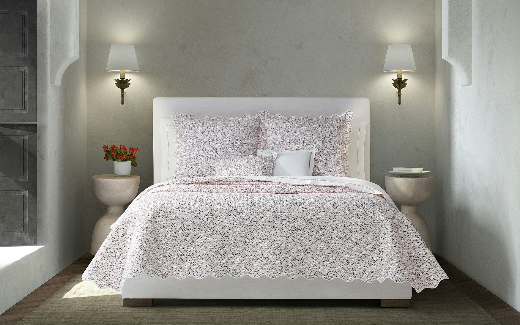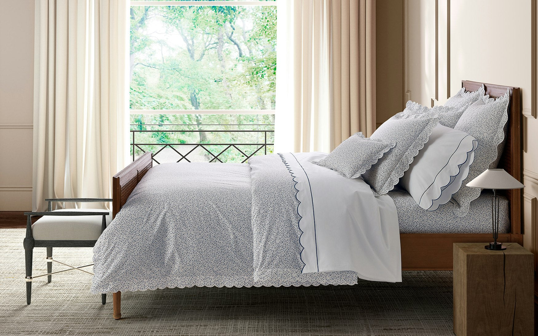 Chic and charming Celine features the painterly dots of Schumacher's classic "Duma", reimagined for the bed in five graphic colors that stand out against the white background of our 500 thread count Luca Egyptian cotton percale. Finished with a perfect embroidered scalloped edge, Celine is a go-to match for both vibrant prints and rich solids.