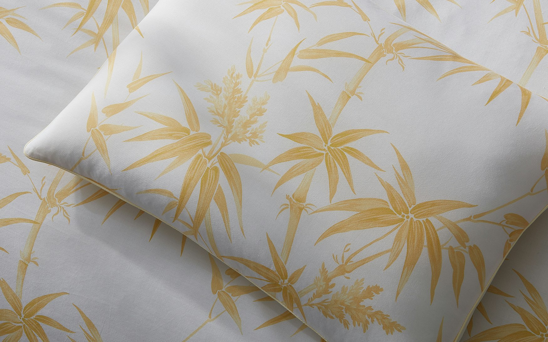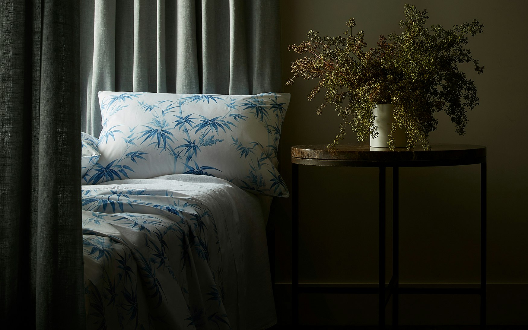 A reimagining of Schumacher’s Arita floral, Dominique features tropical bamboos and airy botanicals on Luca percale.