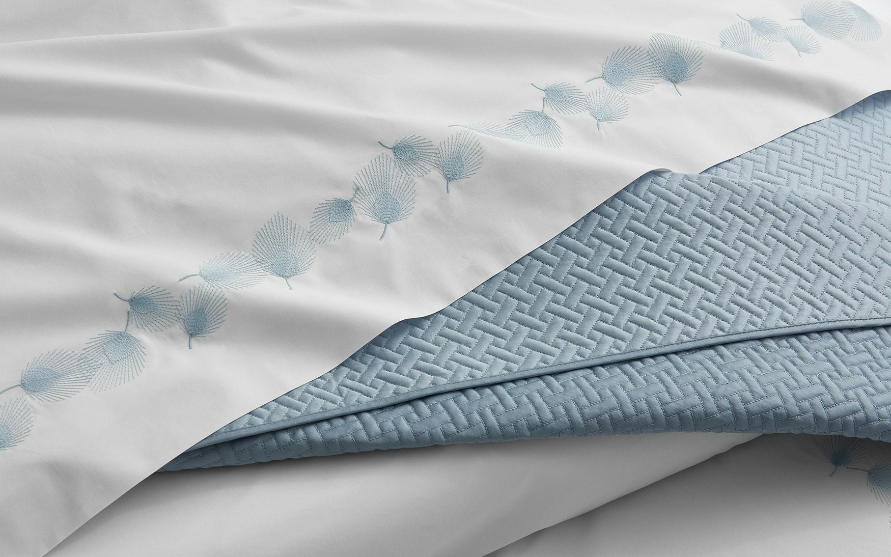Pairing classic Matouk embellishment techniques with our finest Giza Egyptian cotton percale, Feather is one of our most exquisite designs. A unique combination of appliqué and embroidered details adorns our luxurious Gatsby 1000 thread count sheeting, creating a bed of unmatched quality, craftsmanship, and elegance.