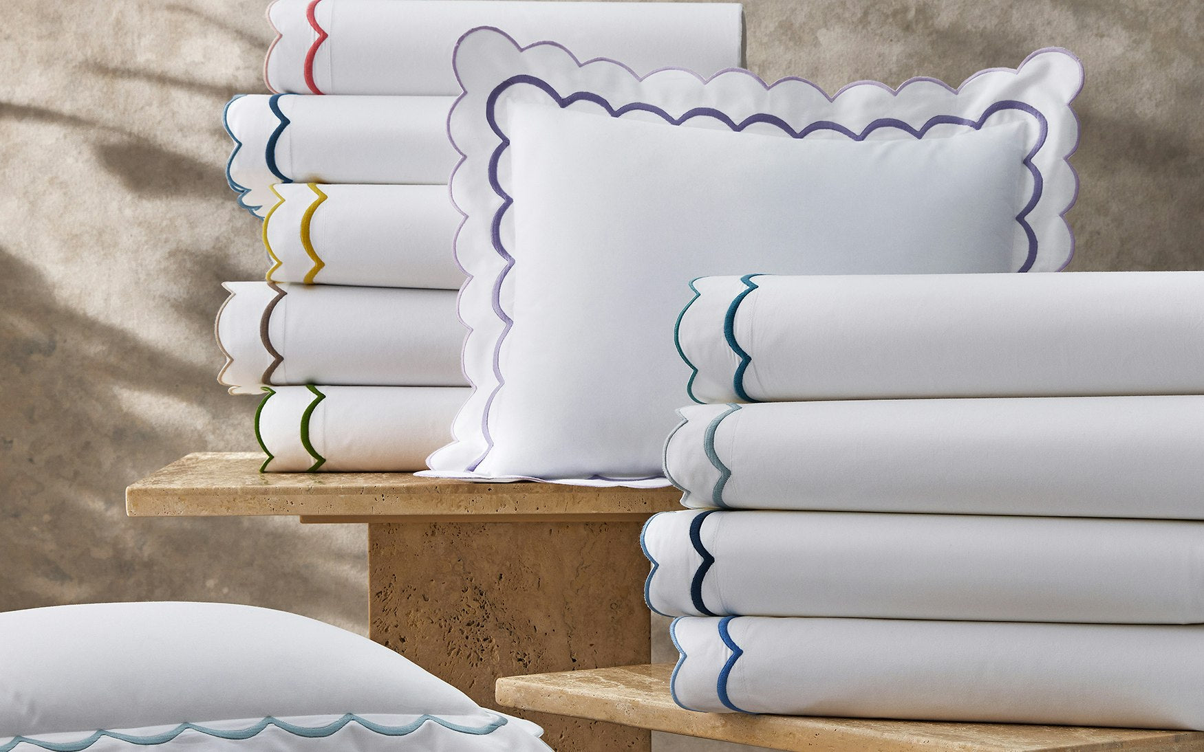 India owes its playful sophistication to an original take on embroidery. Along its narrow, scalloped flange are two carefully stitched lines in two distinct tones. Our 350 thread count Sierra percale is the base fabric for this sweet, elegant style.