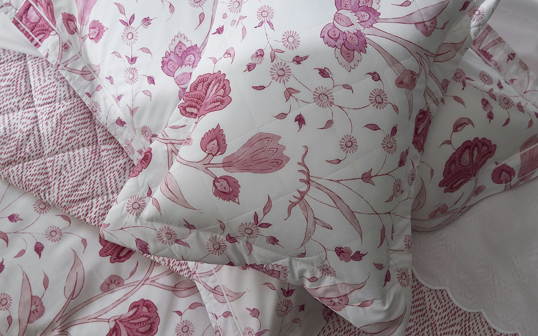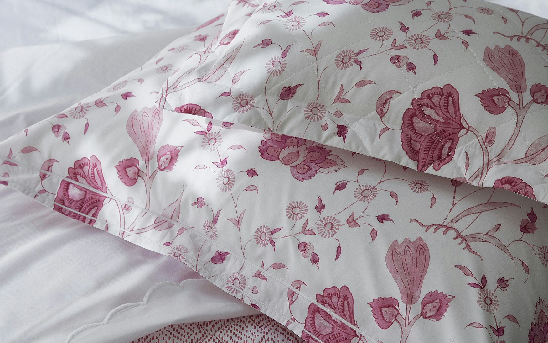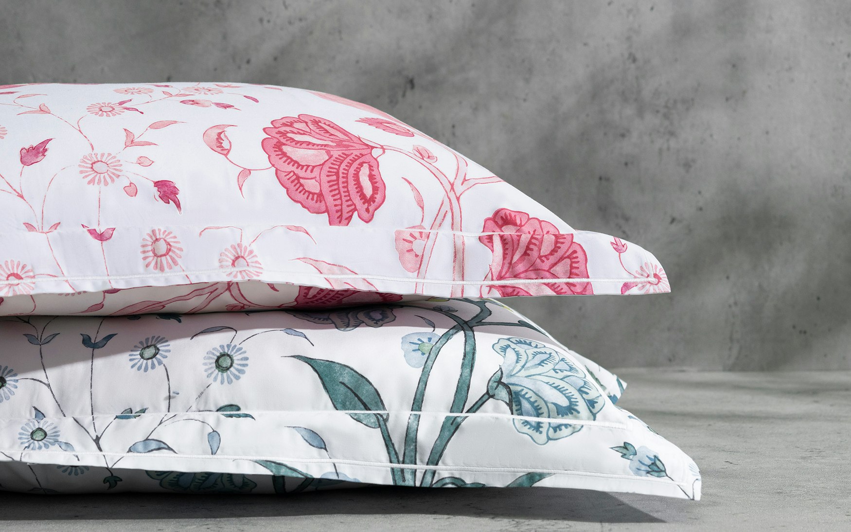 Khilana, a delightful, large-scale floral inspired by traditional Indian hand-block textiles, is a divine addition to the Matouk Schumacher collection. It begins with our 500 thread count Luca Egyptian cotton percale, printed in Italy in a refined blue colorway, and is finished in our Massachusetts factory, where we craft a flange with a unique double satin stitch along the outer and inner edges.