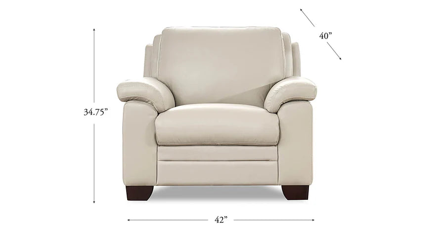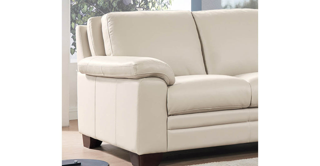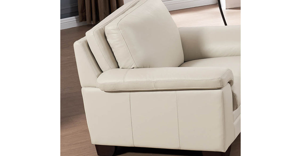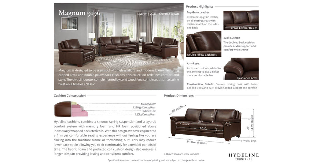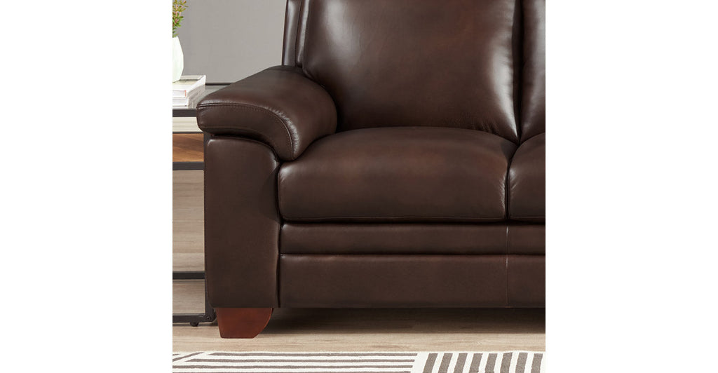 - Premium Leather: Top-grain leather is upholstered on the seating areas and armrests. Leather match is used on the sides and back.