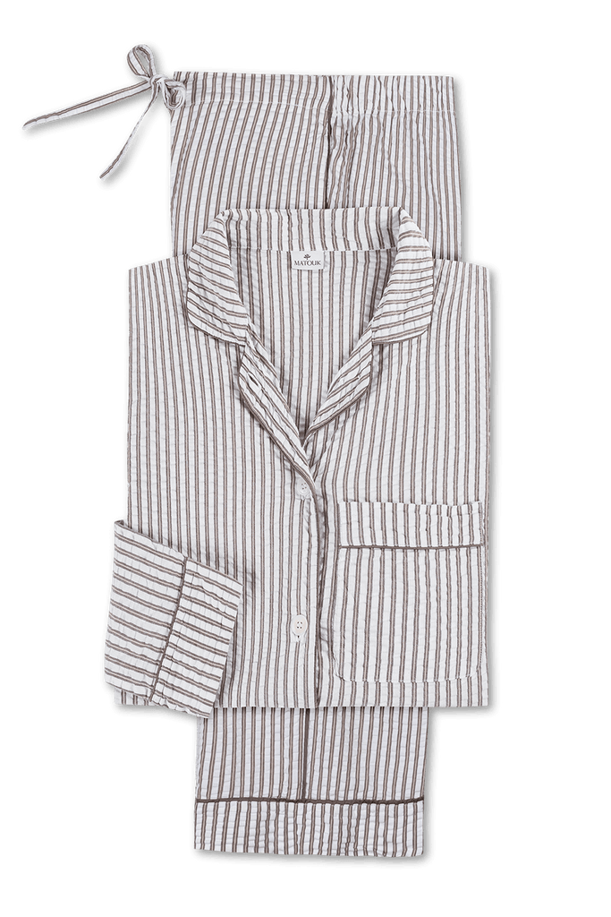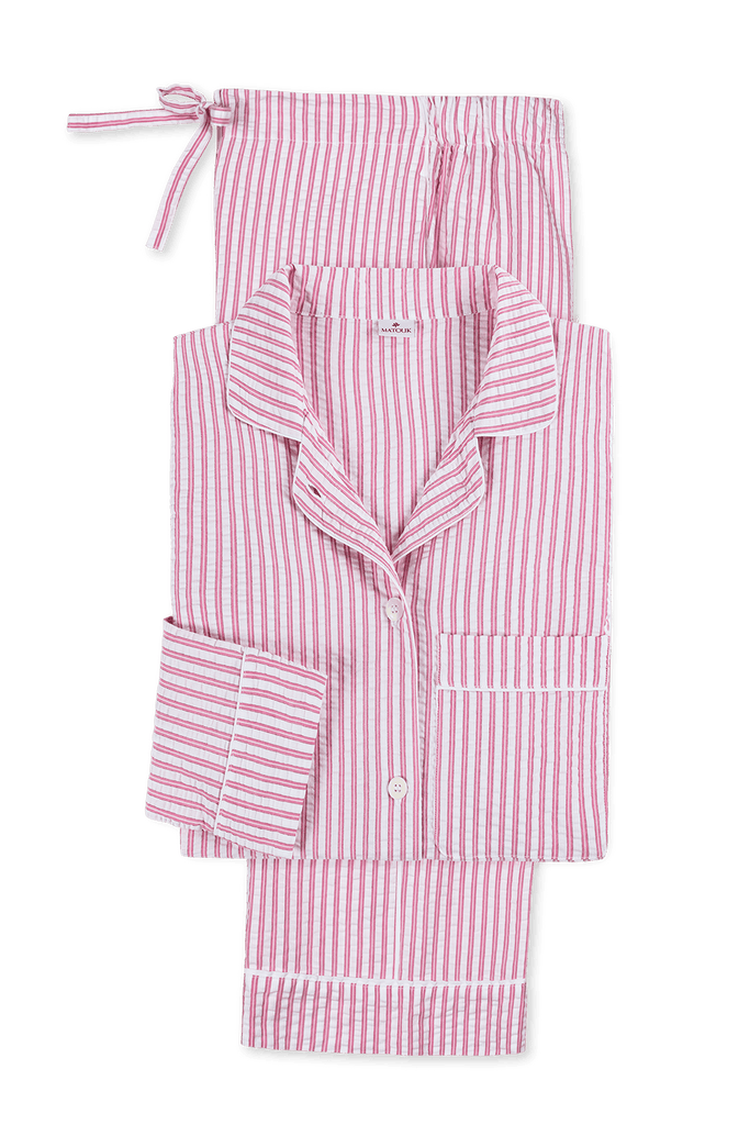 Elevate your loungewear with our Matteo pajamas, featuring a button-down shirt and drawstring pant in lightweight seersucker cotton. This classic striped look adds sophistication to leisurely nights and mornings, and looks just as great out of the house as it does curled up at home.