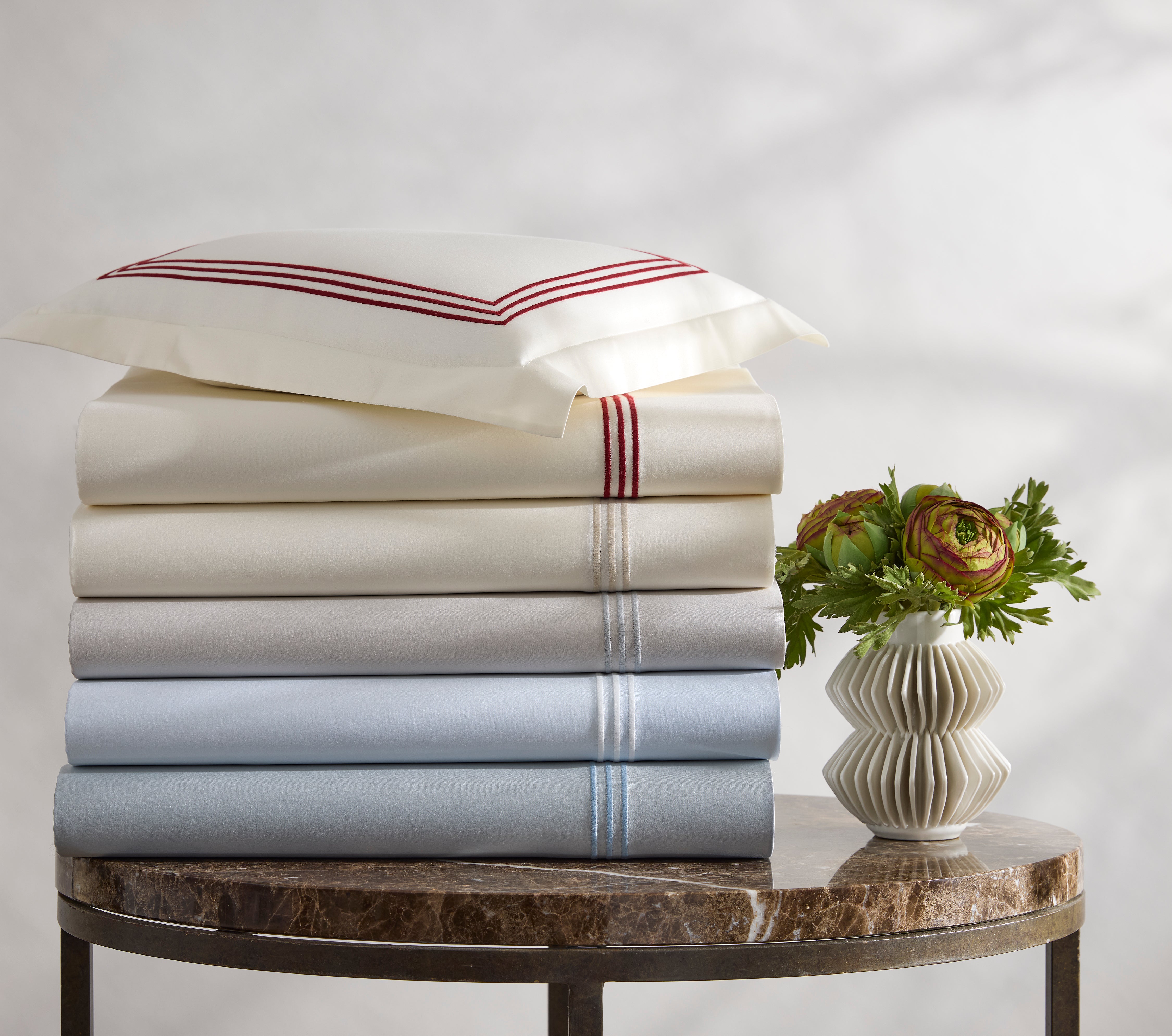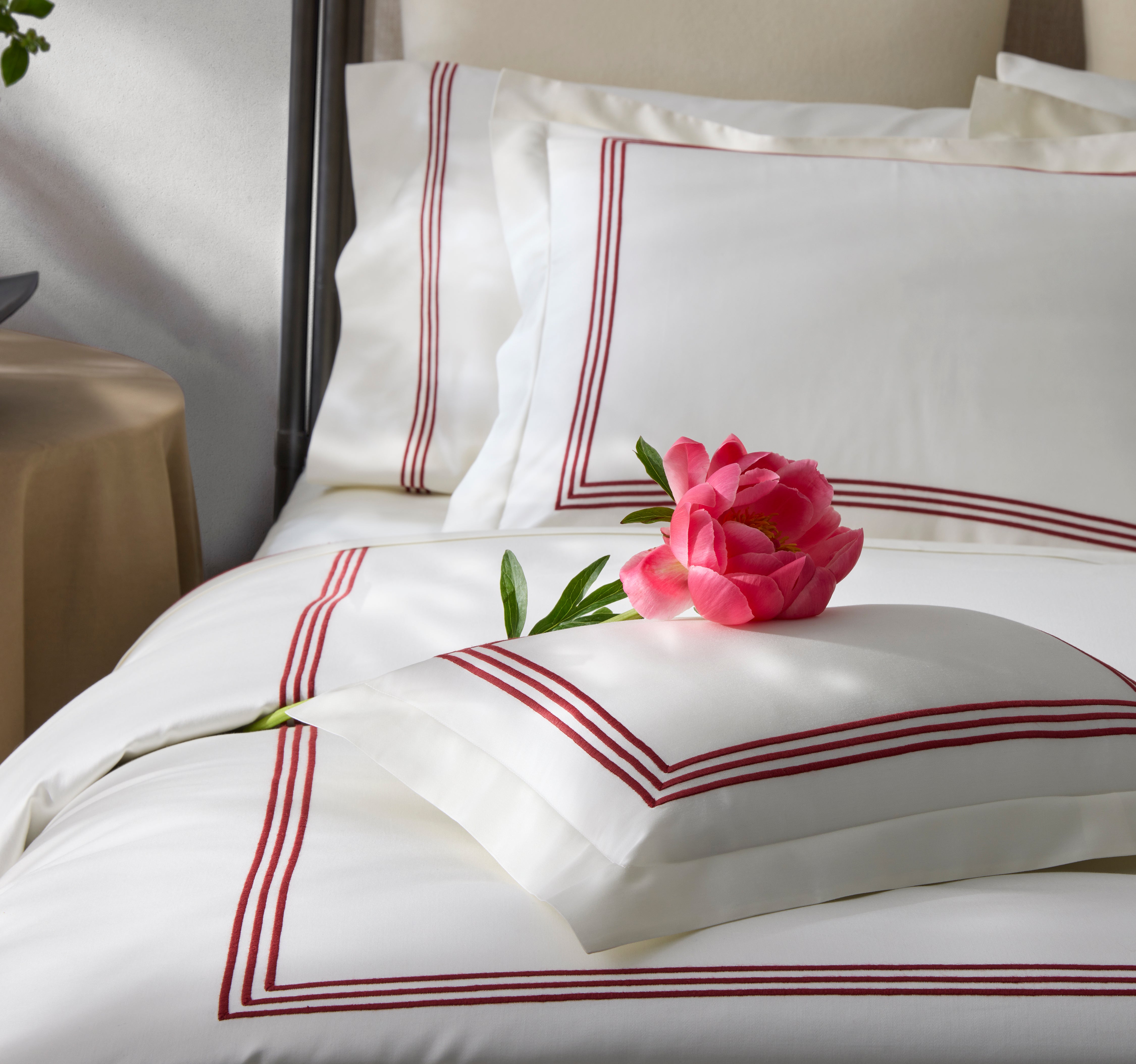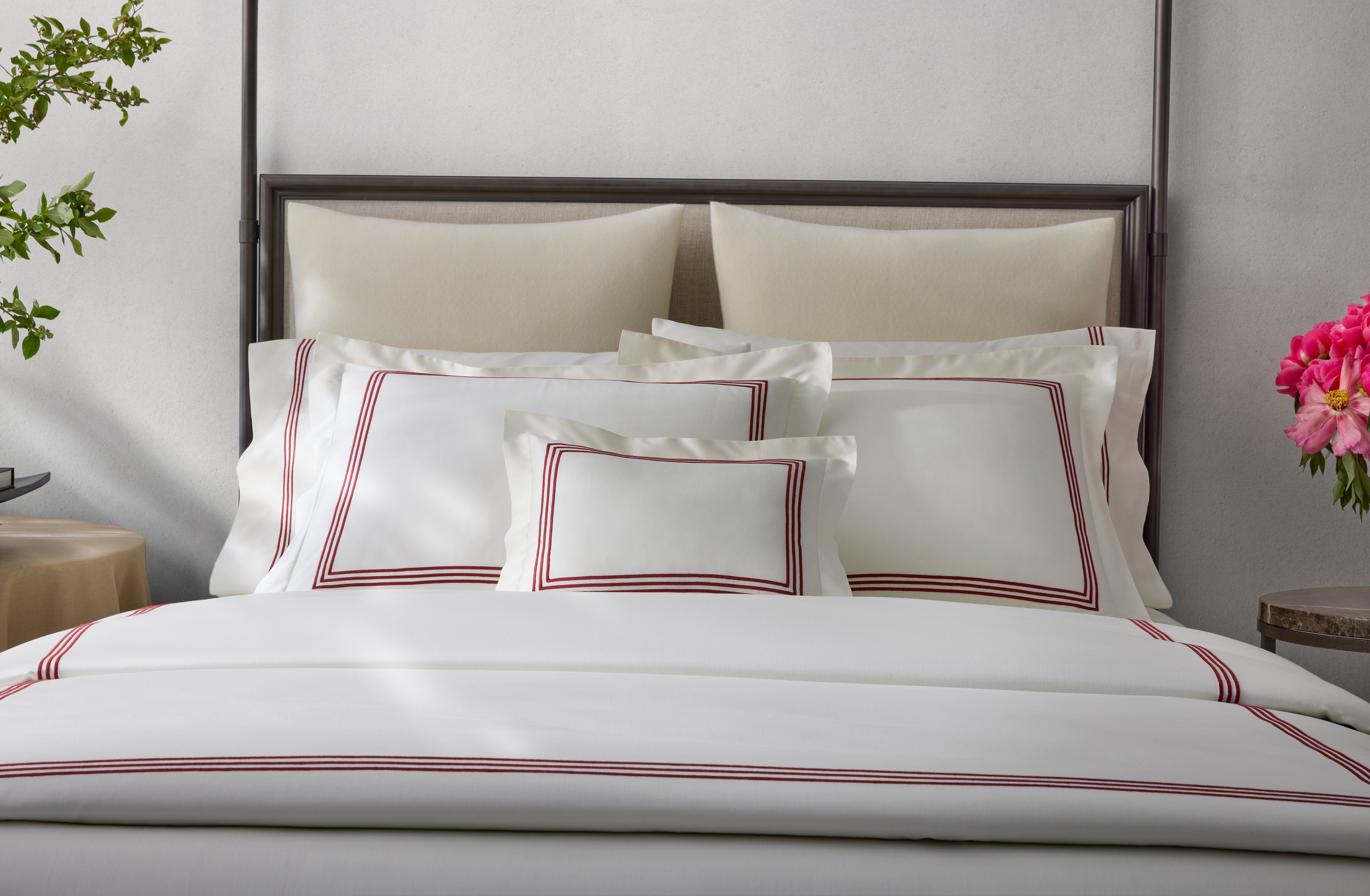 A much anticipated addition to our signature collection, Bel Tempo Nocturne brings Matouk's iconic embroidery to our beloved sateen sheeting for the first time. The flat sheet is specially finished with a return embroidery, a detail usually reserved for our bespoke designs. Bel Tempo Nocturne is offered in a diverse palette of muted neutrals and bold contrasts.
