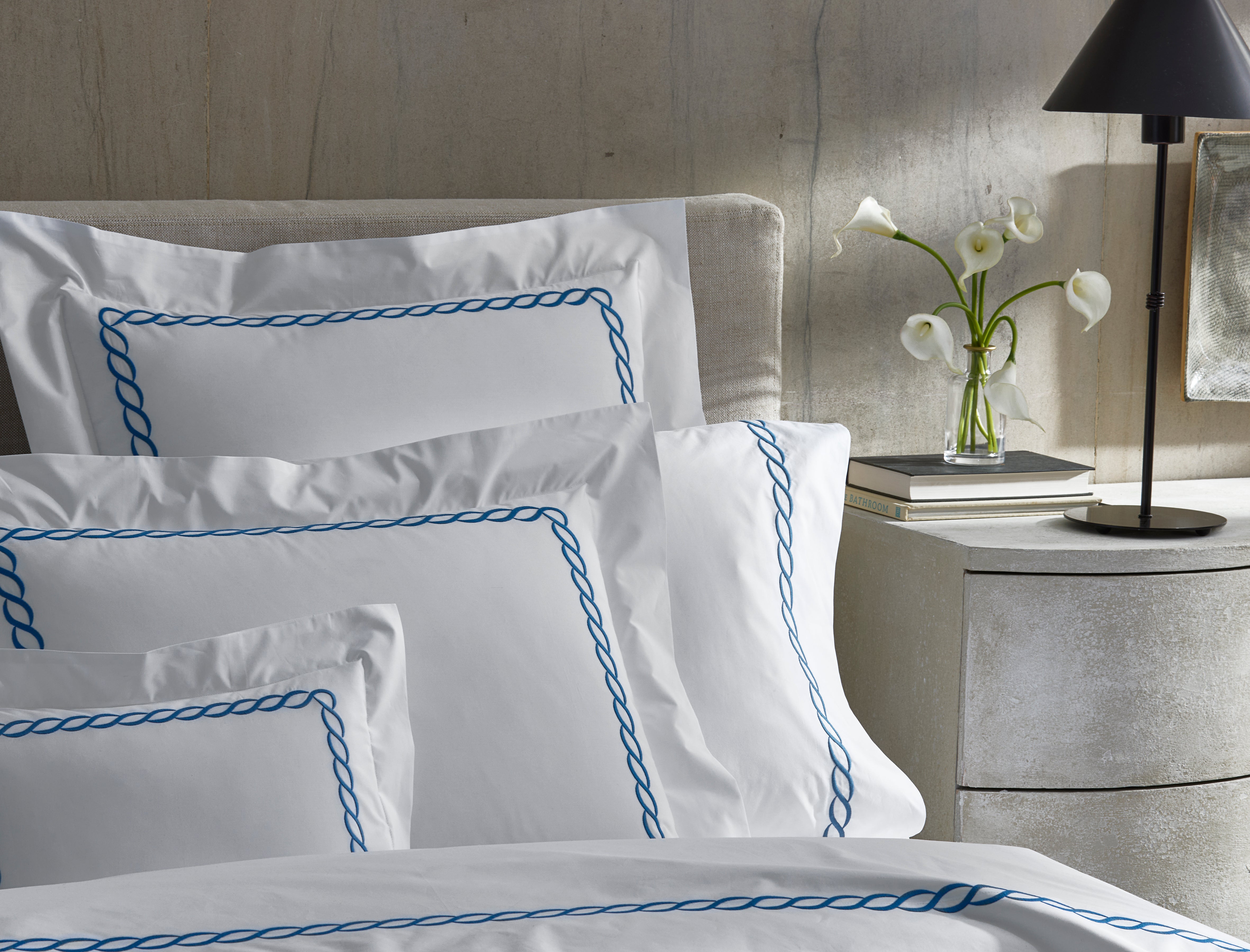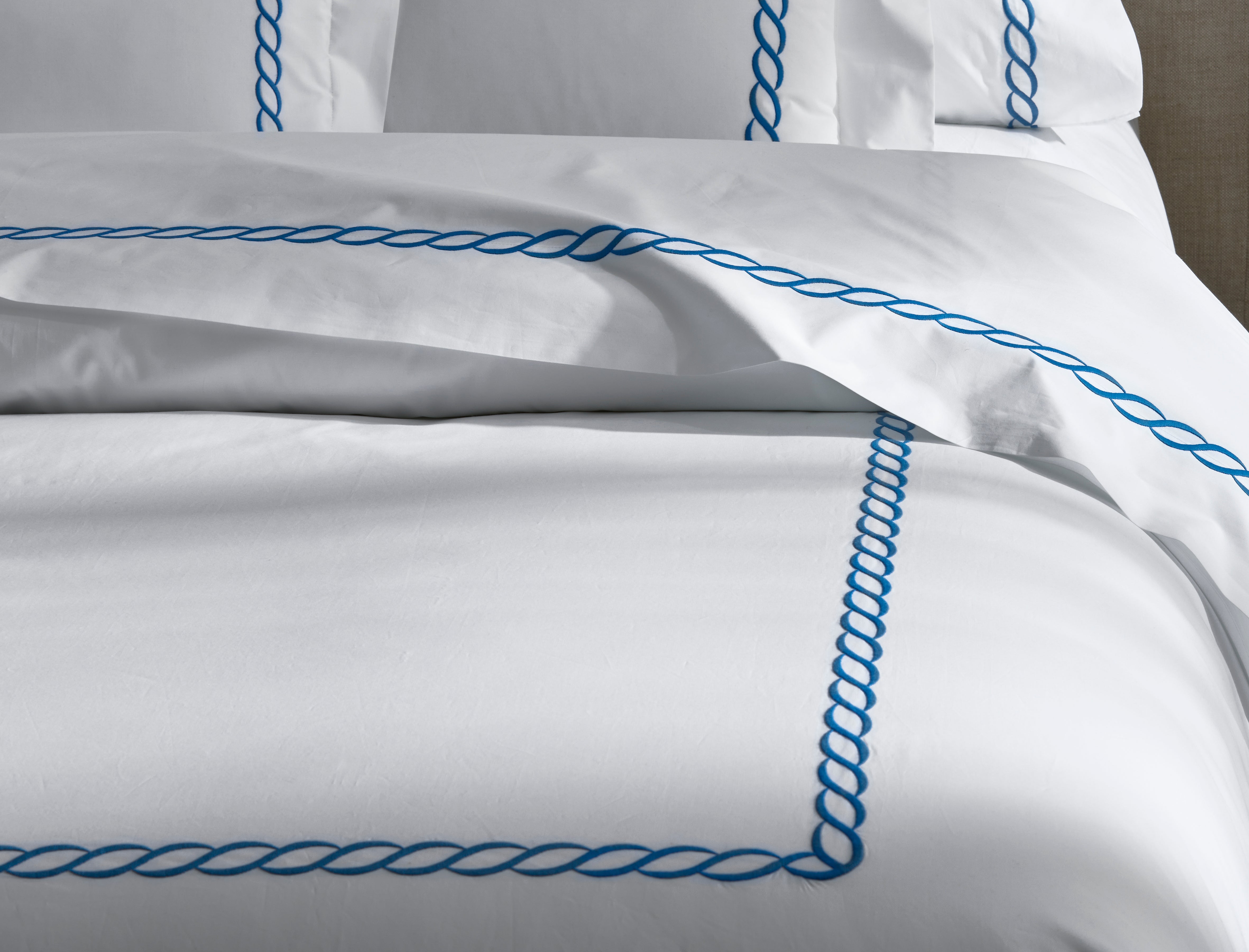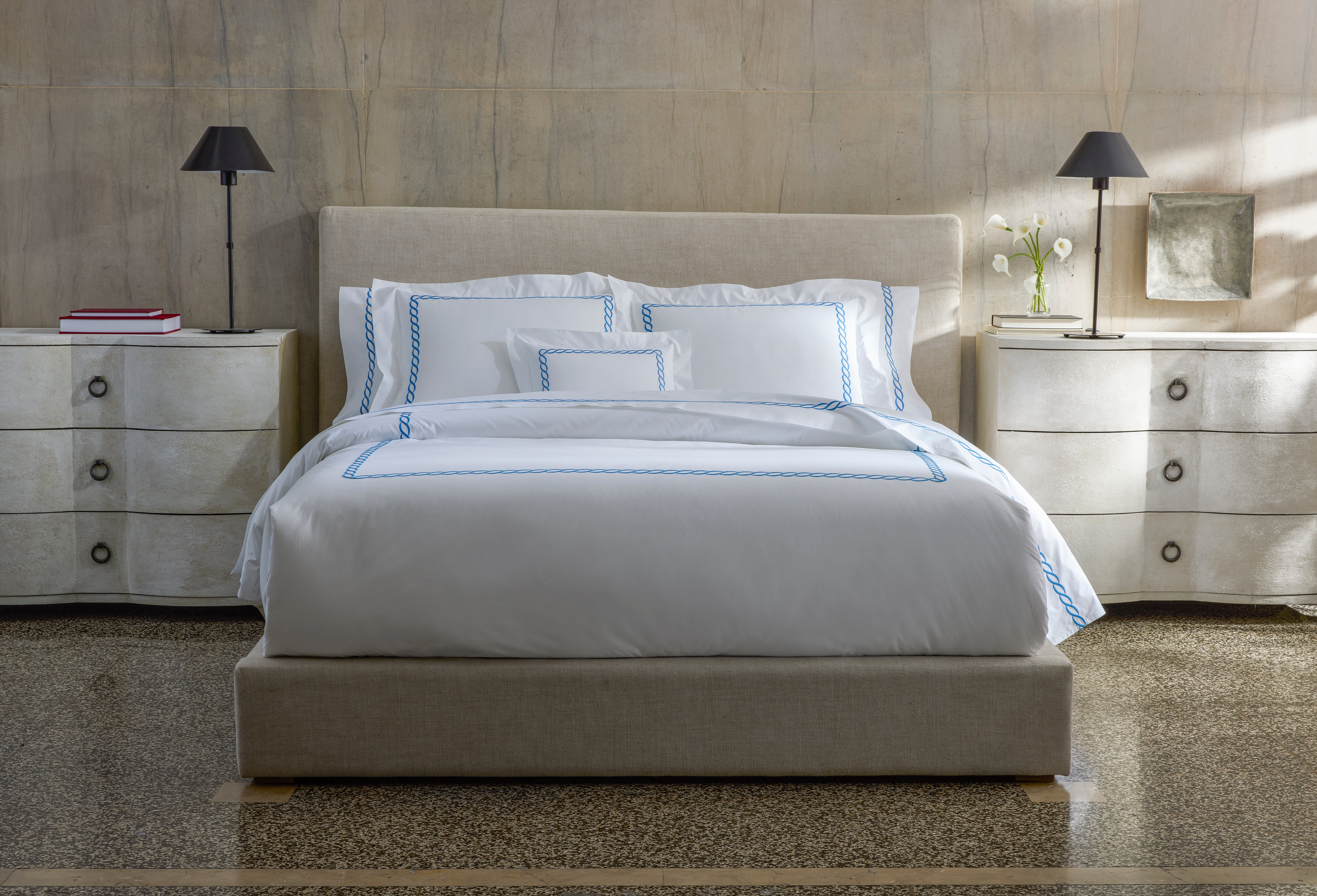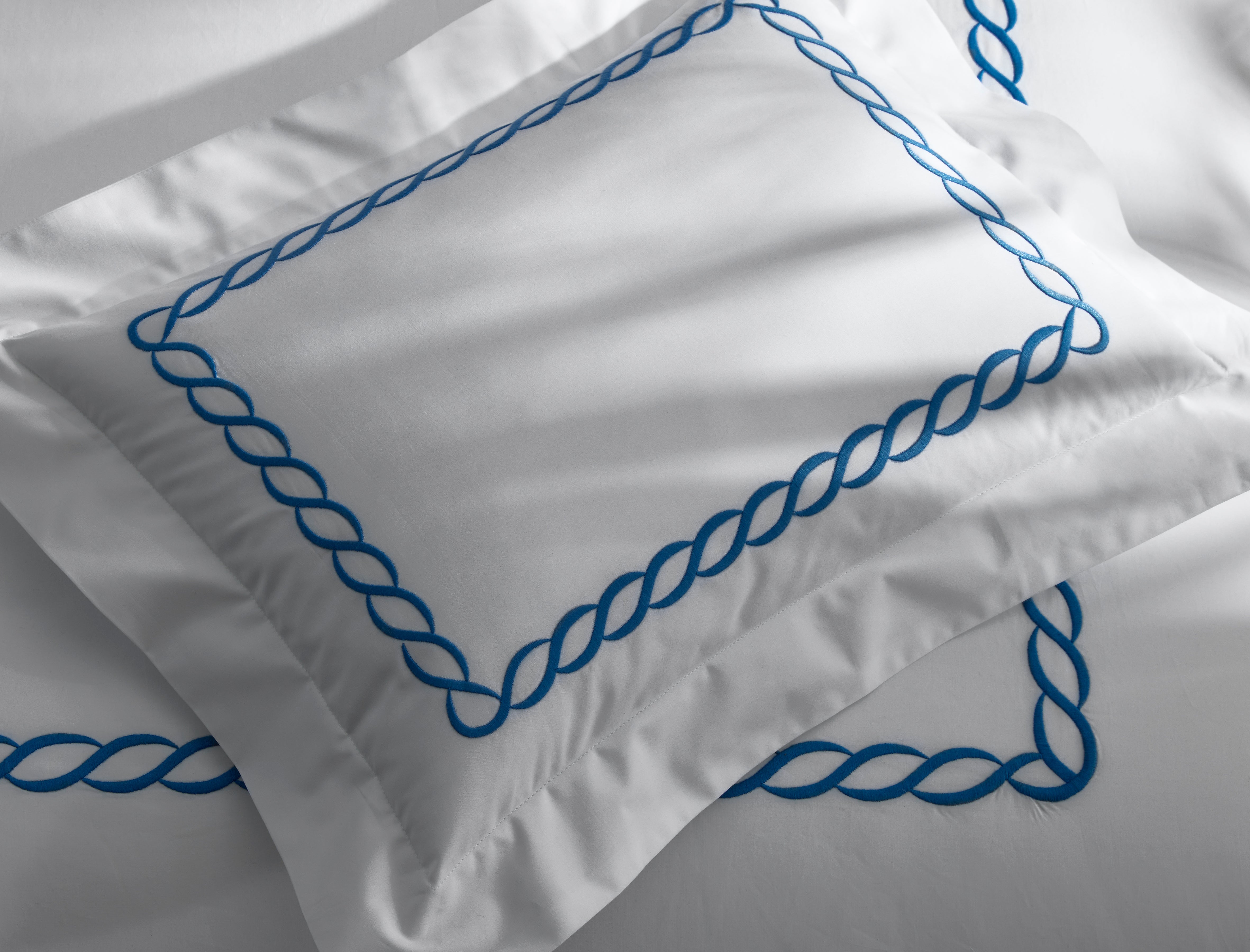 Inspired by a classical Greek motif, a fluid chain embroidery on our 350 thread count Sierra cotton percale creates an understated look for your bedroom.