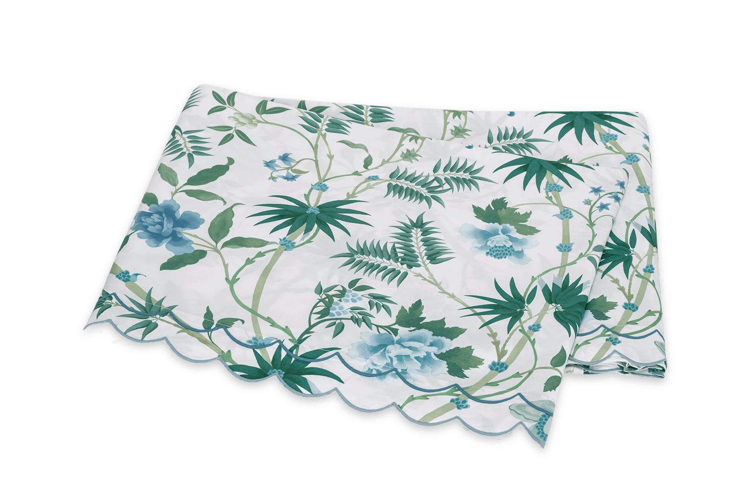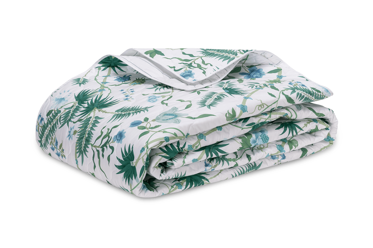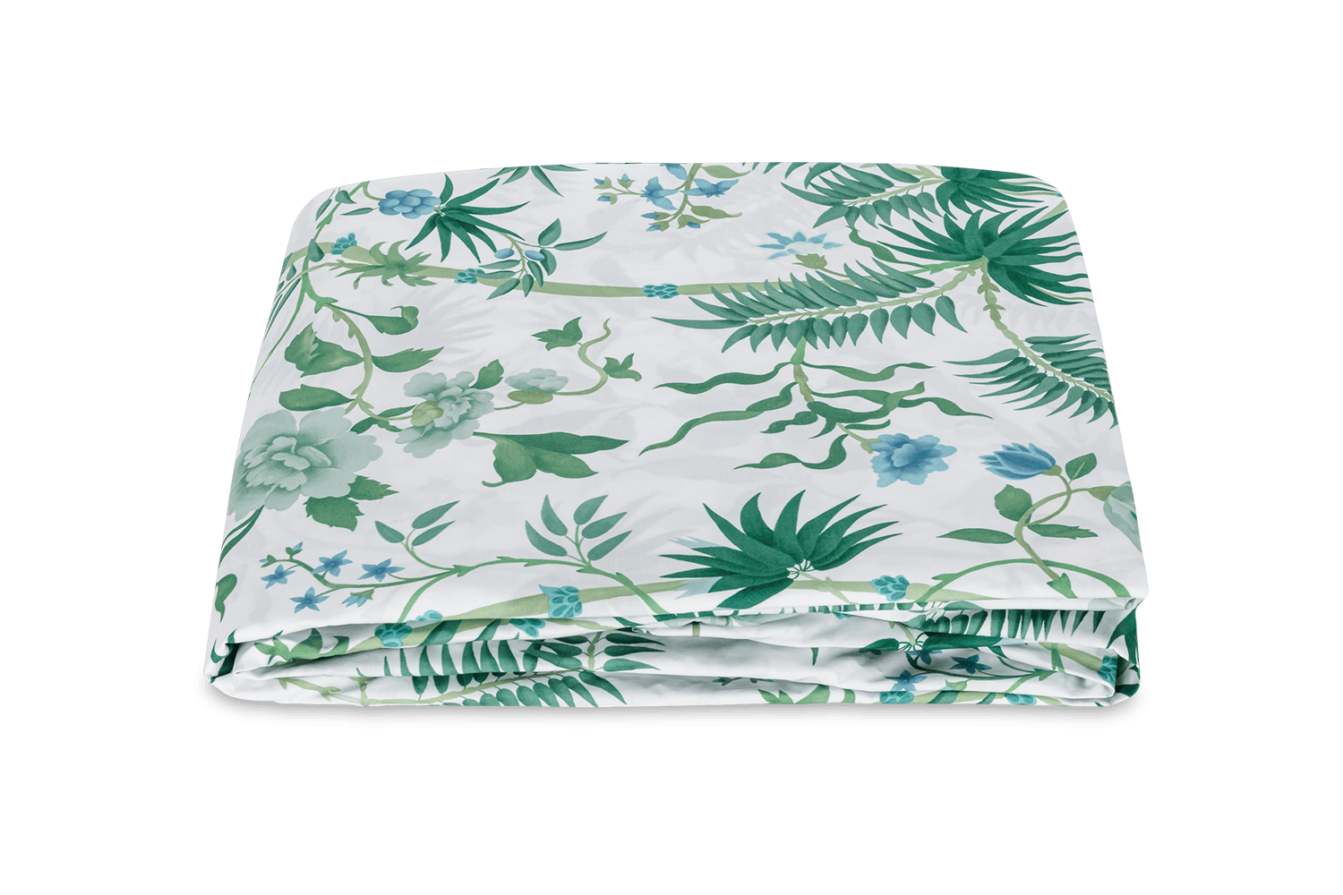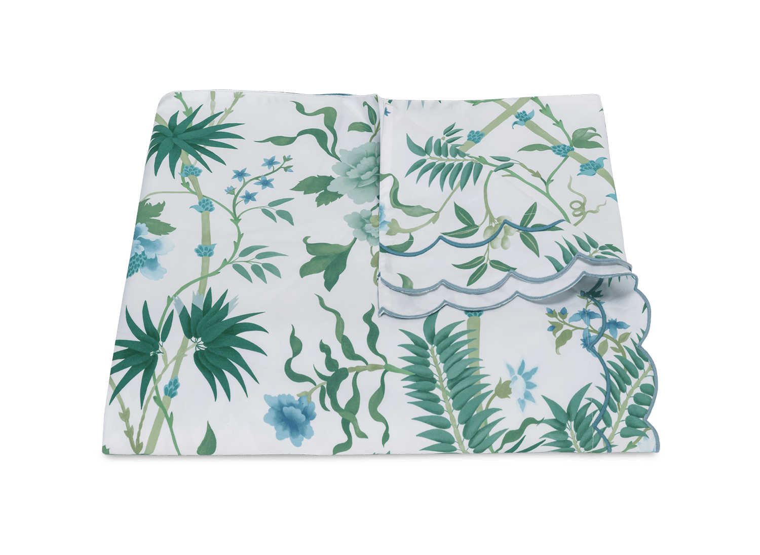 Based on a vibrant Schumacher wallpaper, this tropical print is rendered in a lush emerald and blue-green palette with oversized palm fronds and blooms. Printed on Luca Egyptian cotton percale and finished with a double scallop embroidery, Palmyra offers an island-inspired escape that feels both tranquil and transportive.