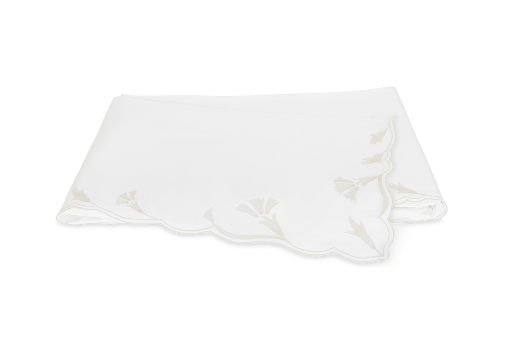 This delicate embroidered collection on luminous Nocturne sateen features elongated, scalloped florals whose tonal shifts lend depth and dimension to this classic look. Without any visible stitching, the trim drapes seamlessly—offering a sense of softness and sophistication to the bed.