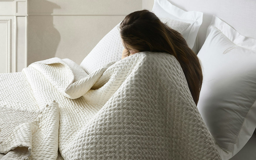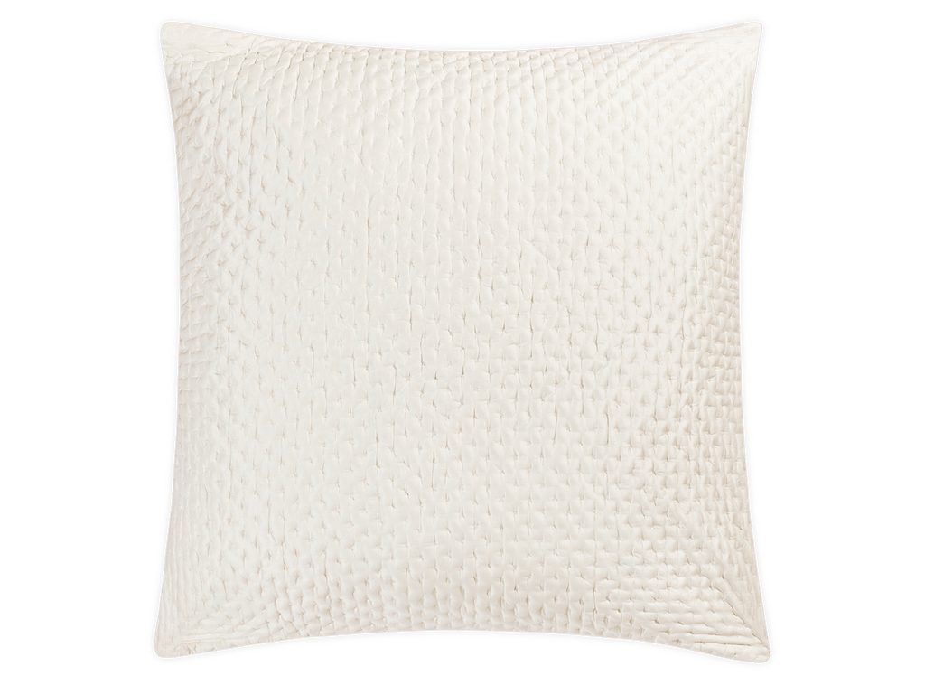 Margaret is precious in feel and robust in craft, featuring 100% hand-stitched silk quilting across the front and cotton voile on the back. It’s breathable, elegant and has a natural texture and versatility, whether tucked in formally or casually strewn across a bed. Small round poms along its edge make a delightful accent.