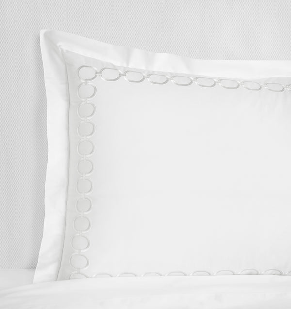 Sleek and modern, Catena’s hallmark lies in its minimalist chain motif, inspired by the timelessness of fine jewelry. Framing a canvas of pristine white percale, the design is embroidered with immaculate precision in five distinct colorways. Each selection features a two-tone embroidery technique, creating a sense of depth.