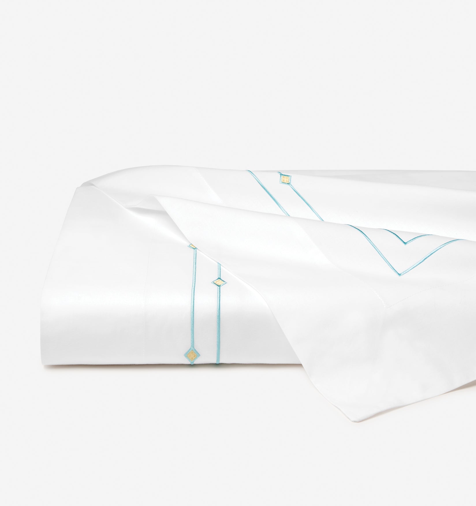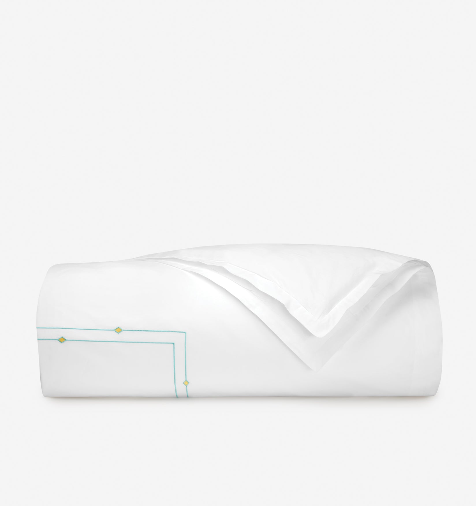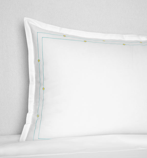 A satin-stitch double border of aqua, accented by yellow diamond details, imbues the Diamantini embroidery collection with a sense of playful sophistication, pairing beautifully with our whimsical Geometrico collection for a finished look that brings a youthful spirit to the bedroom.