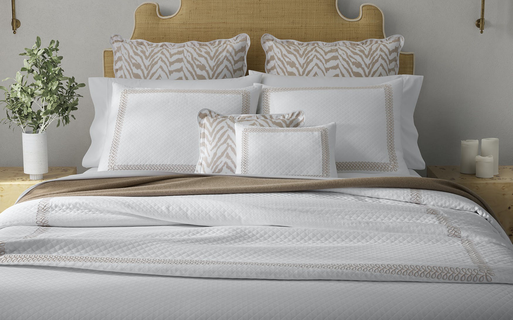 Embroidered on our crisp 520 thread count Ceylon percale, Astor Braid is a style with quintessential appeal. The bold design from Schumacher’s celebrated collection of tapes and trims is a timeless script, suited for pairing with an array of patterns.