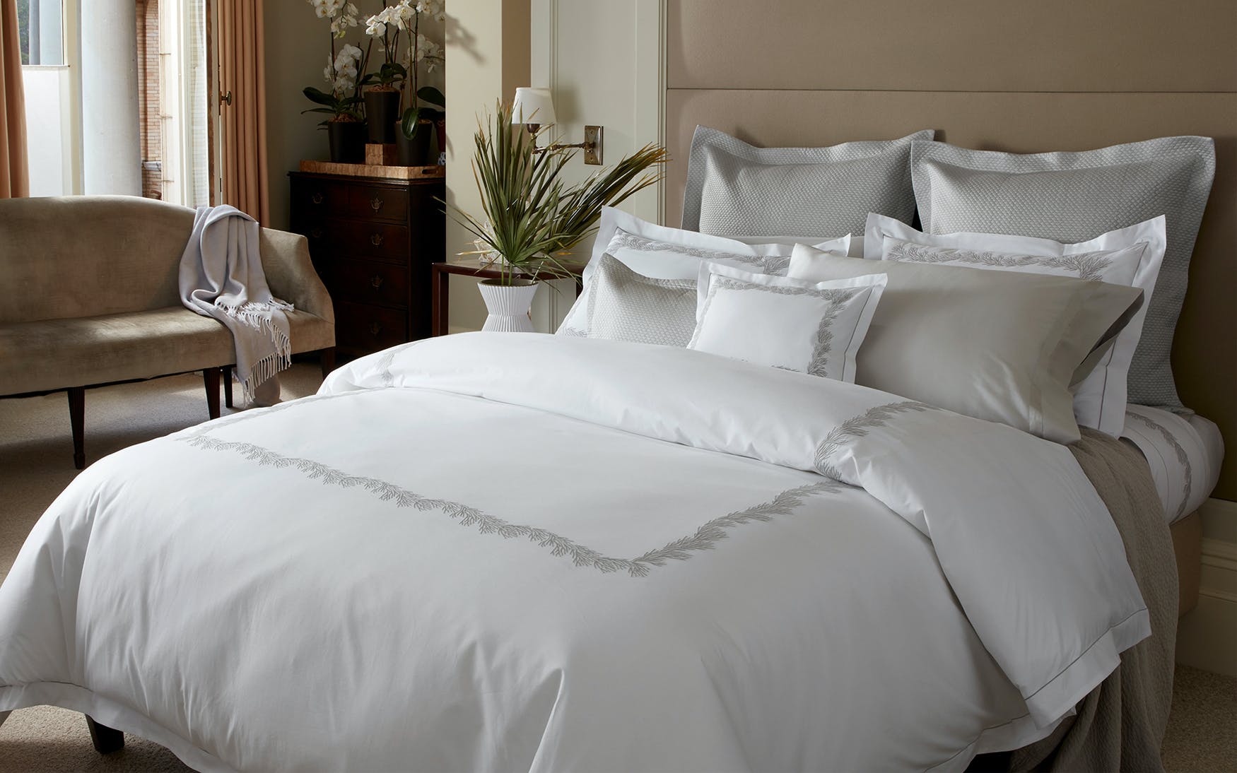 Like the feathery coral found under the Pacific waters, this embroidered pattern gently flows over our crisp 520 thread count Ceylon cotton percale. The design is framed by a small, satin stitch border.