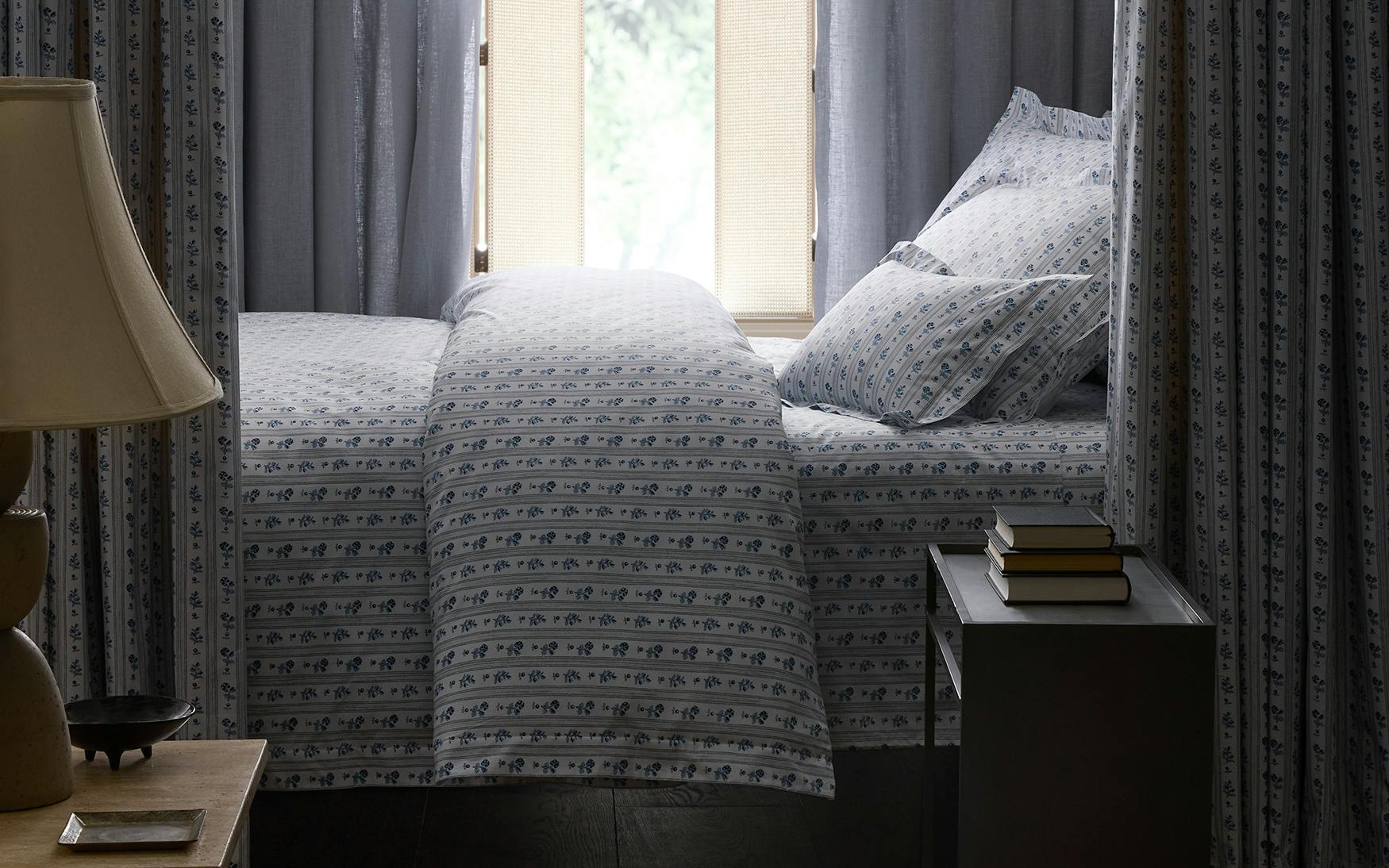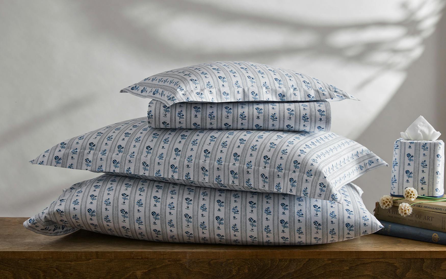 Cabanon Stripe is a Matouk Schumacher print whose delicate stripes and small-scale florals evoke a French Provincial sensibility. Crafted on crisp percale, its clean finish and refined detailing bring an airy elegance to any bed design