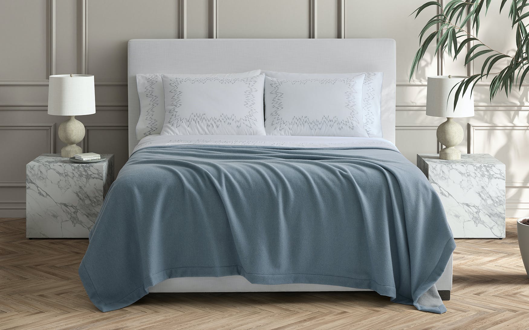 Our Cosmo blanket is crafted from 100% superfine merino wool, known for its remarkably soft hand, temperature regulating qualities, and ability to absorb moisture. Cosmo works perfectly under a duvet on cold nights, or under a lighter quilt or coverlet during spring and fall. Crisp mitered edges and a range of versatile colors - which reverse to a lighter tone for a subtle contrast when turned down - make Cosmo a good option for the top of a bed during warmer months.