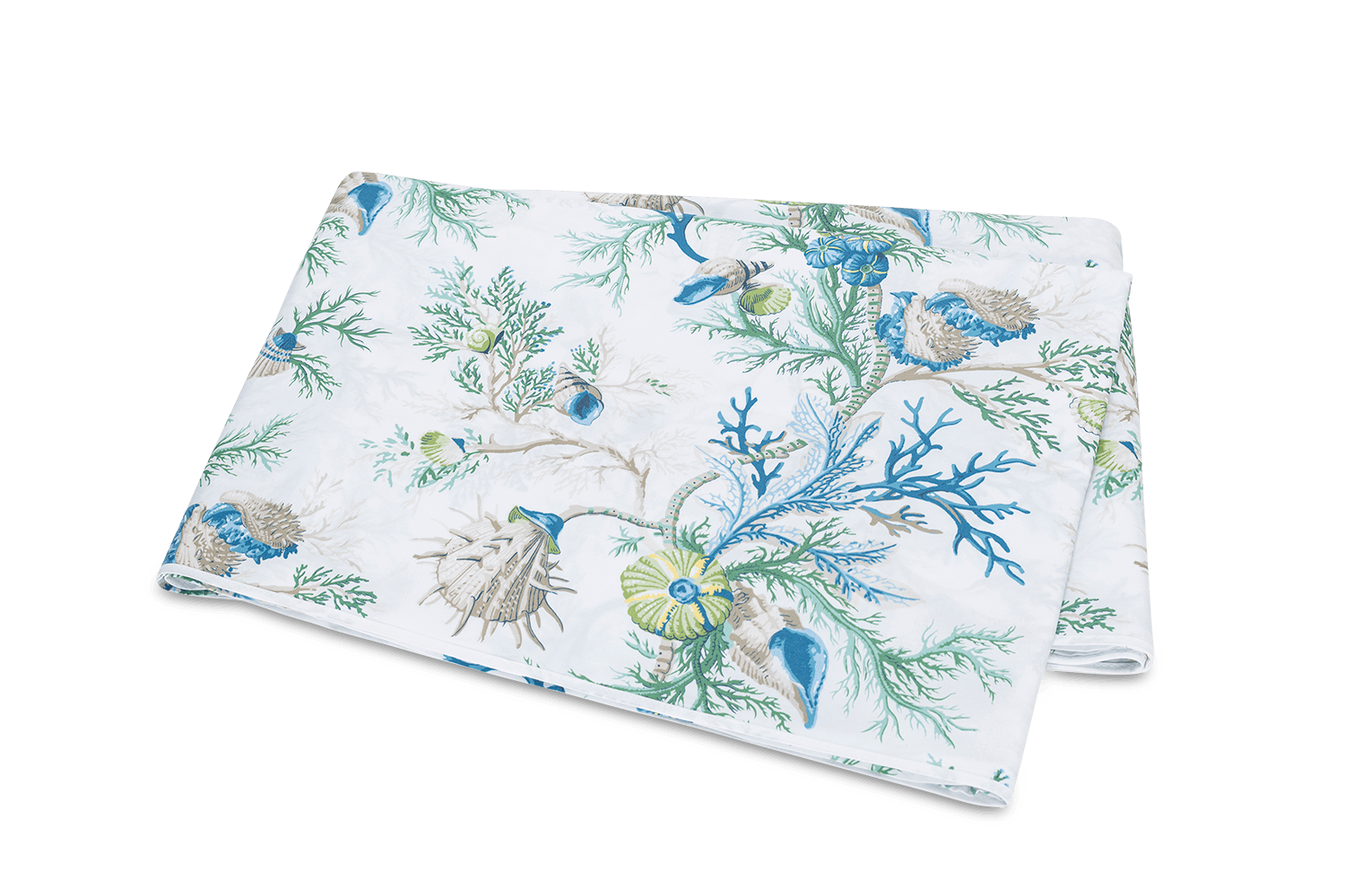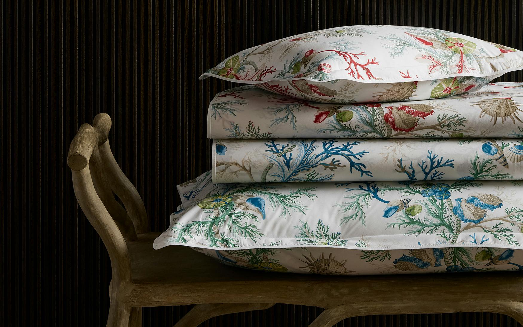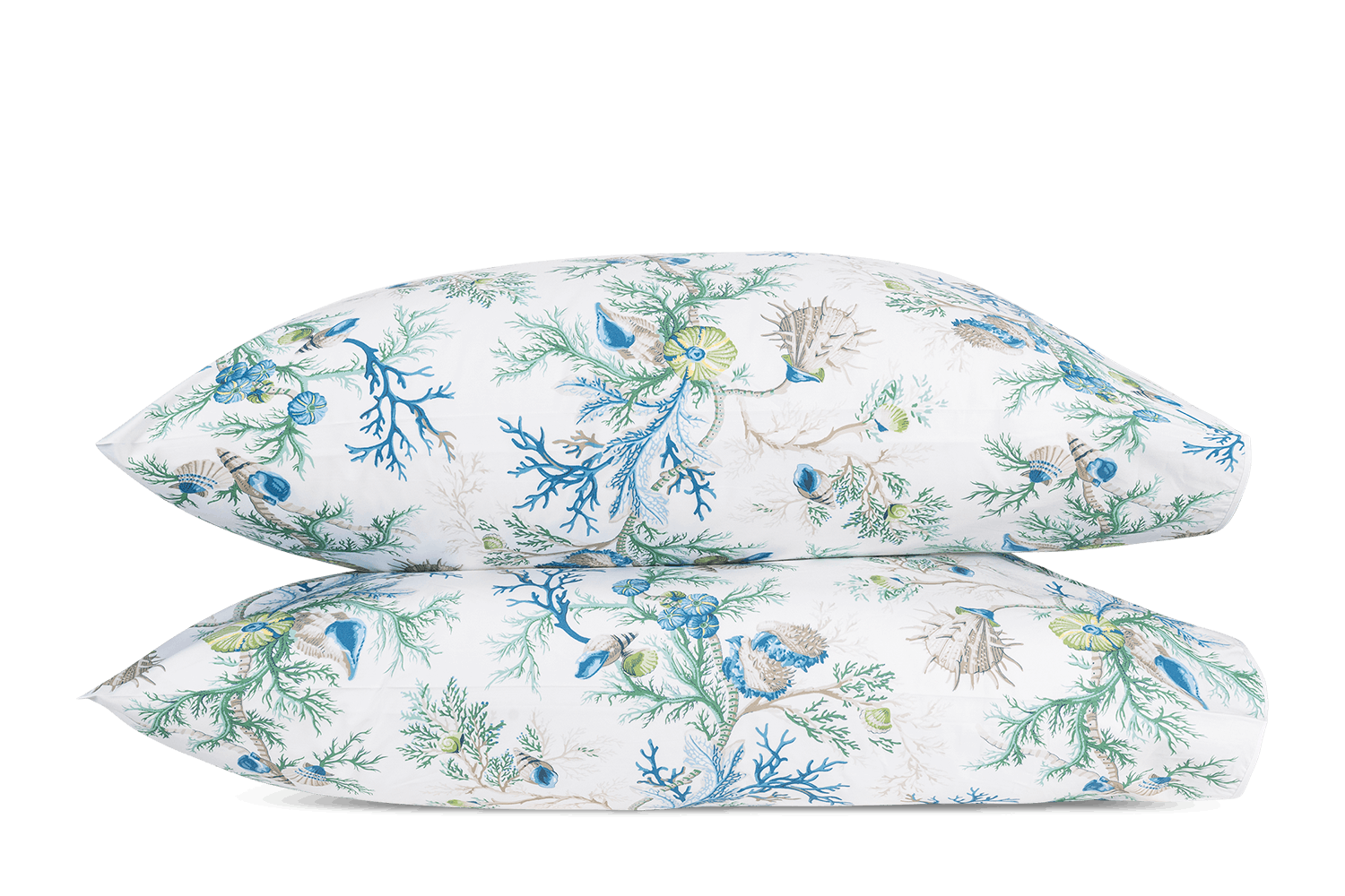 There’s a whimsical element to this deep-sea toile by Schumacher, filled with vibrant colors and maritime creatures that evoke a feeling of underwater elegance. Set in a linear pattern on 500 thread count printed Luca percale, Del Tesoro is oceanic fantasy at its finest.