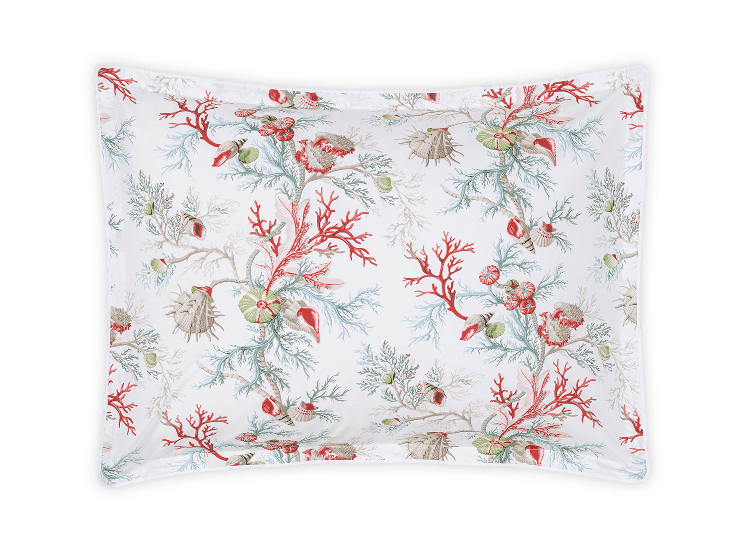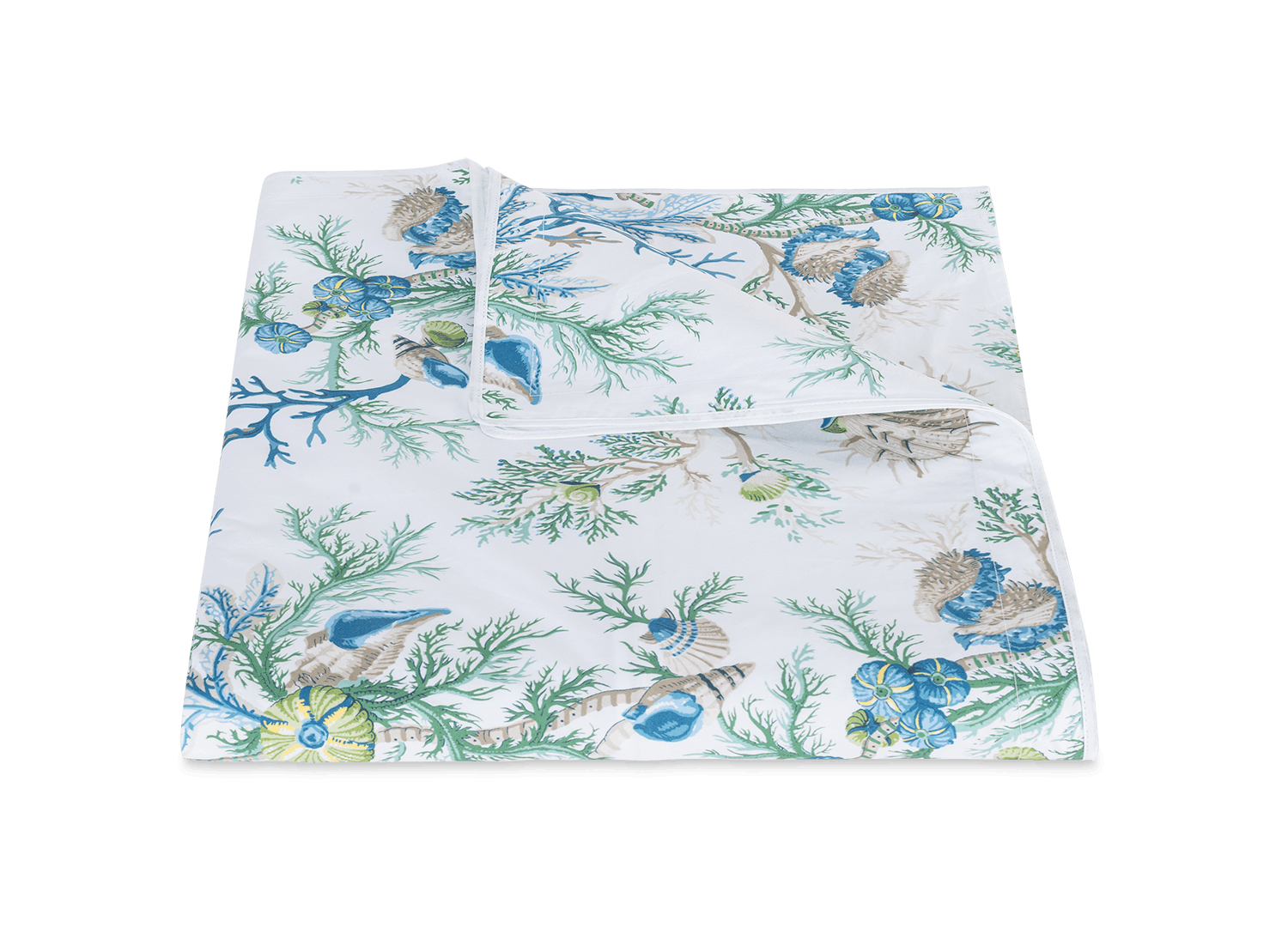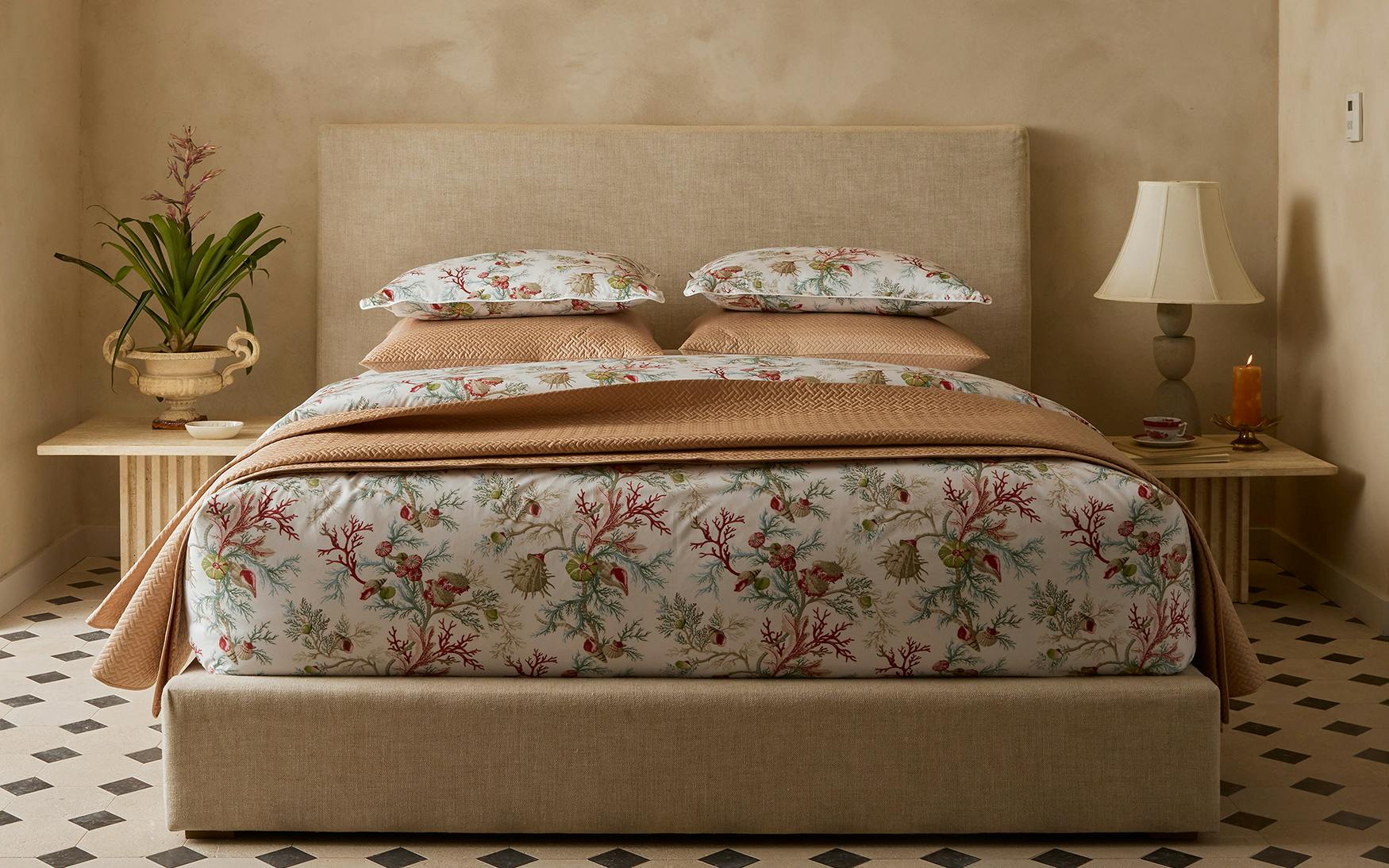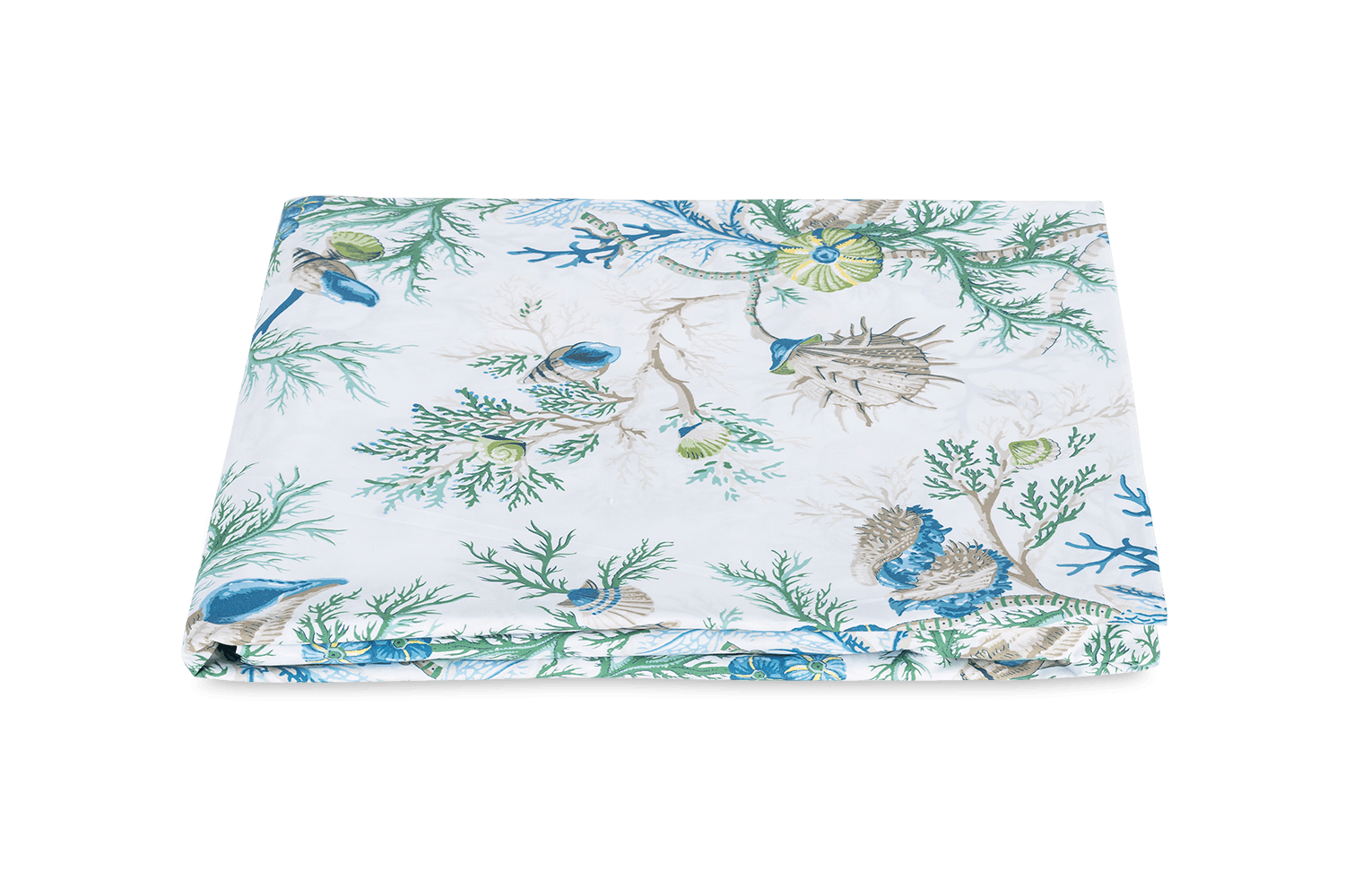 There’s a whimsical element to this deep-sea toile by Schumacher, filled with vibrant colors and maritime creatures that evoke a feeling of underwater elegance. Set in a linear pattern on 500 thread count printed Luca percale, Del Tesoro is oceanic fantasy at its finest.