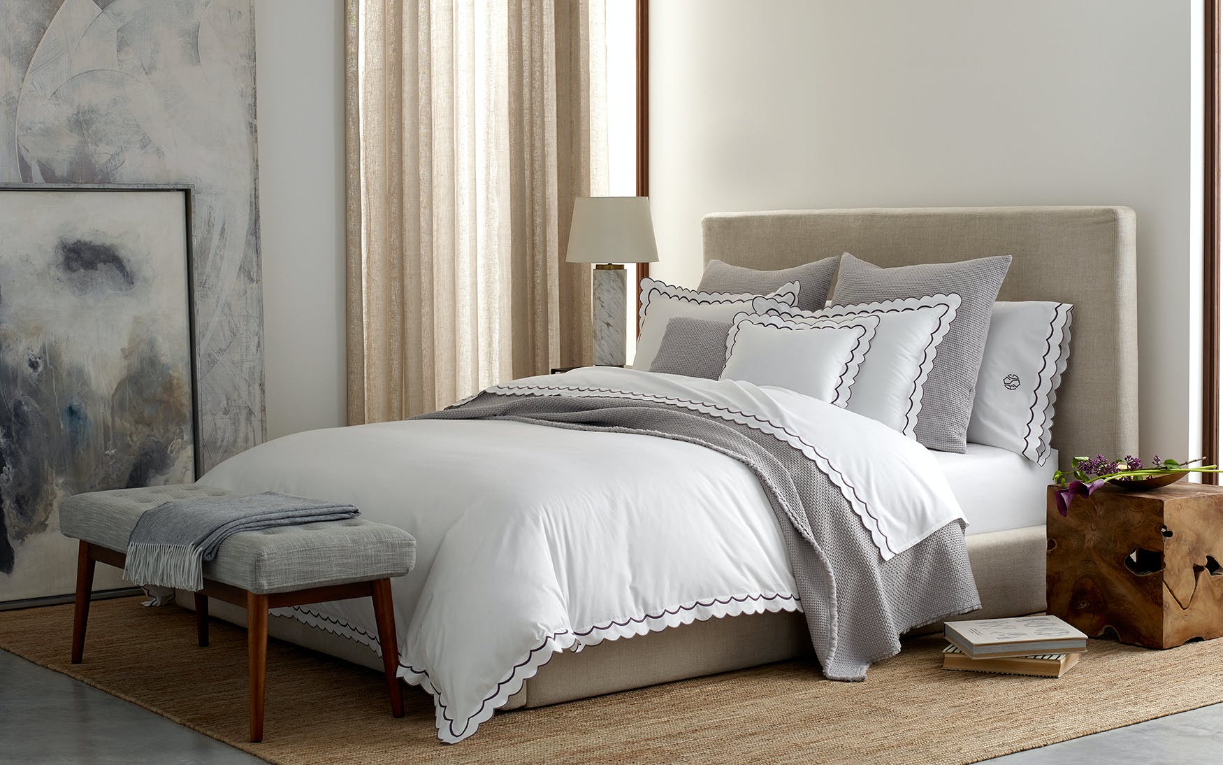 India owes its playful sophistication to an original take on embroidery. Along its narrow, scalloped flange are two carefully stitched lines in two distinct tones. Our 350 thread count Sierra percale is the base fabric for this sweet, elegant style.