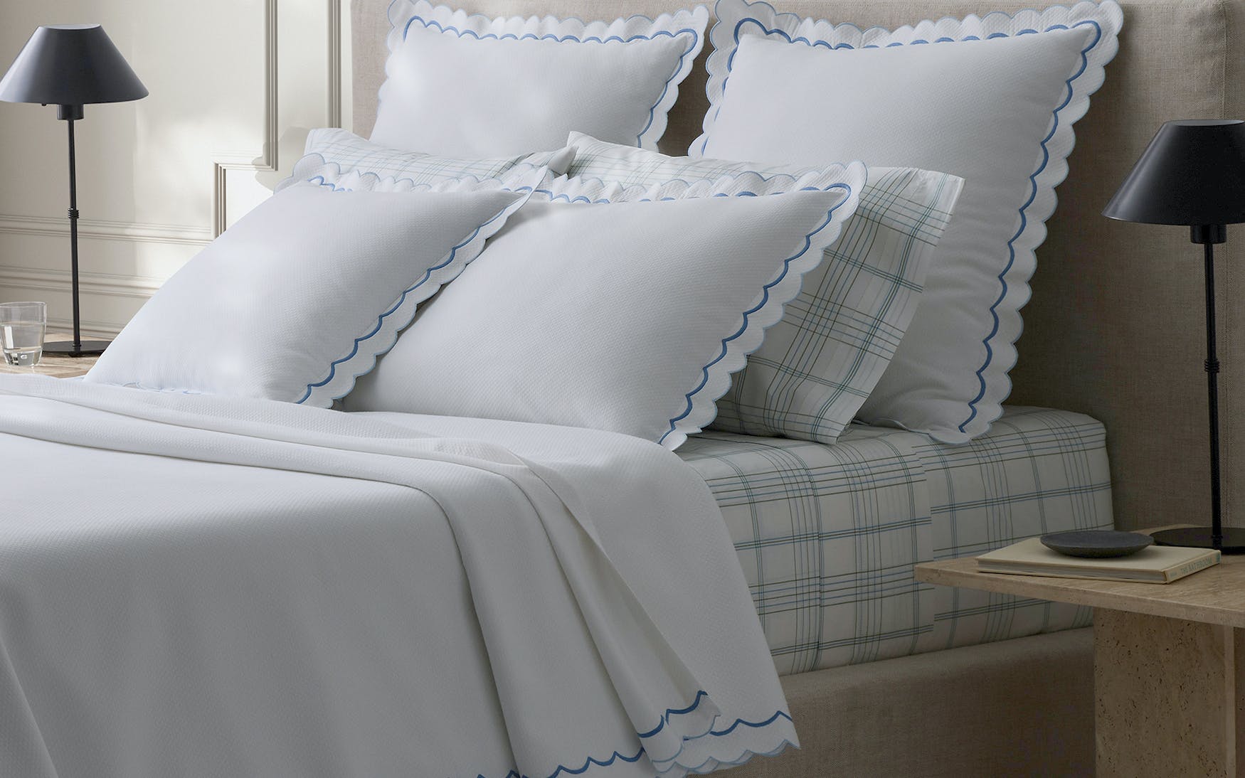 This playful take on line and color sees our popular India double-scallop embroidery on diamond piqué matelassé. Crafted in an easy to care for cotton blend, the style features two-tone edges in a range of delicious hues.