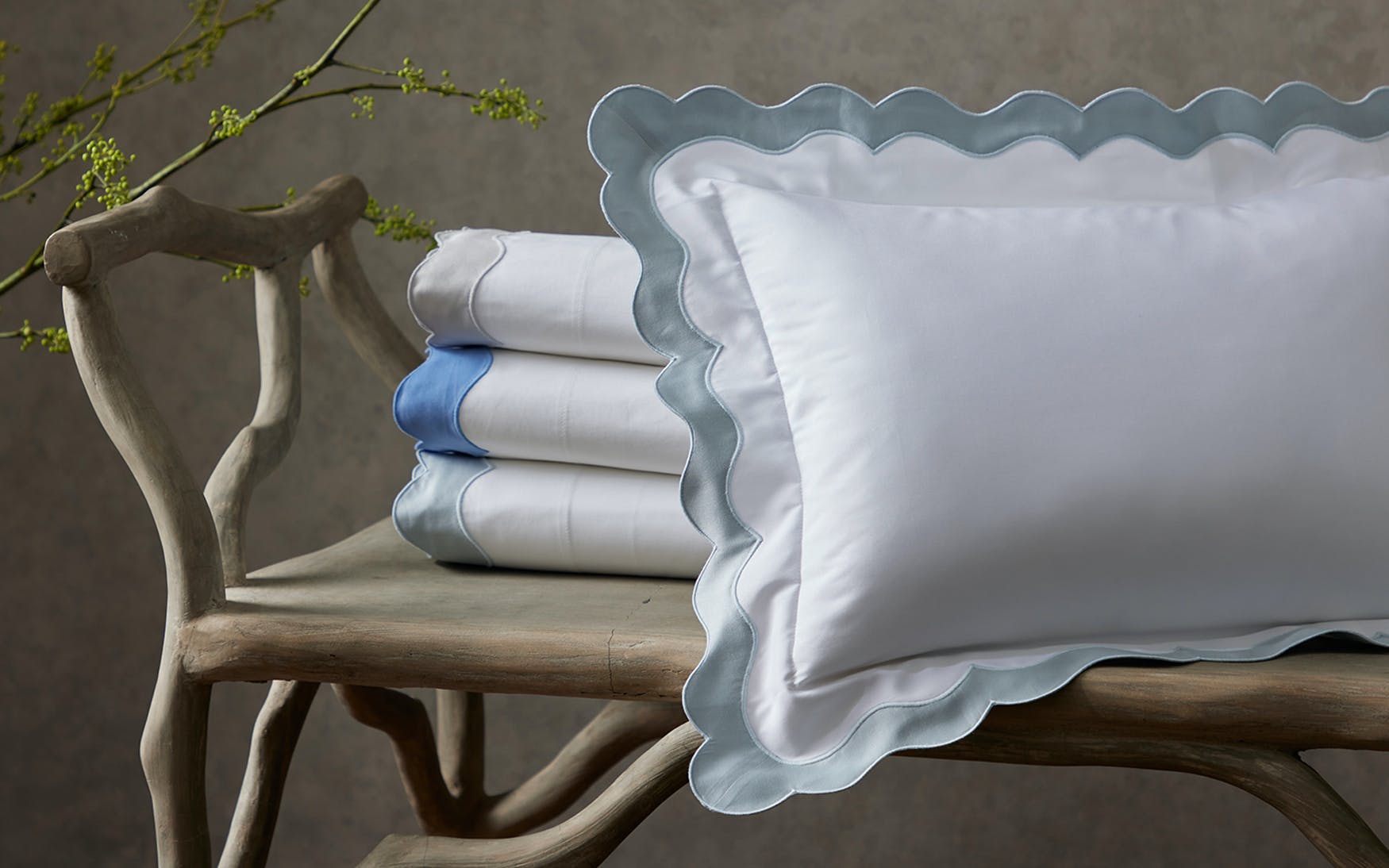 A unique and feminine appliqué scallop gives this style a one-of-a-kind collection a wonderful artisanal look and feel. Cast on our 600 thread count Milano Egyptian cotton percale base with sateen detail, the effect is modern femininity at its best.
