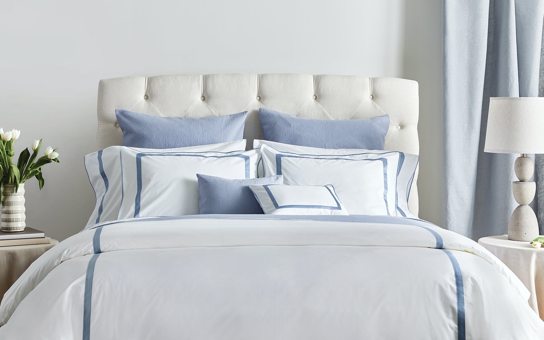 Inspired by our iconic Lowell bedding, Louise is a striking update that showcases two of our finest fabrics. Its base is our incredibly smooth and lightweight 500 thread count Bergamo Giza Egyptian cotton percale and the appliqué is made from our sumptuous Talita Giza Egyptian cotton sateen in seven sophisticated colors. A clean, corded knife edge completes the picture for this meticulously crafted style.