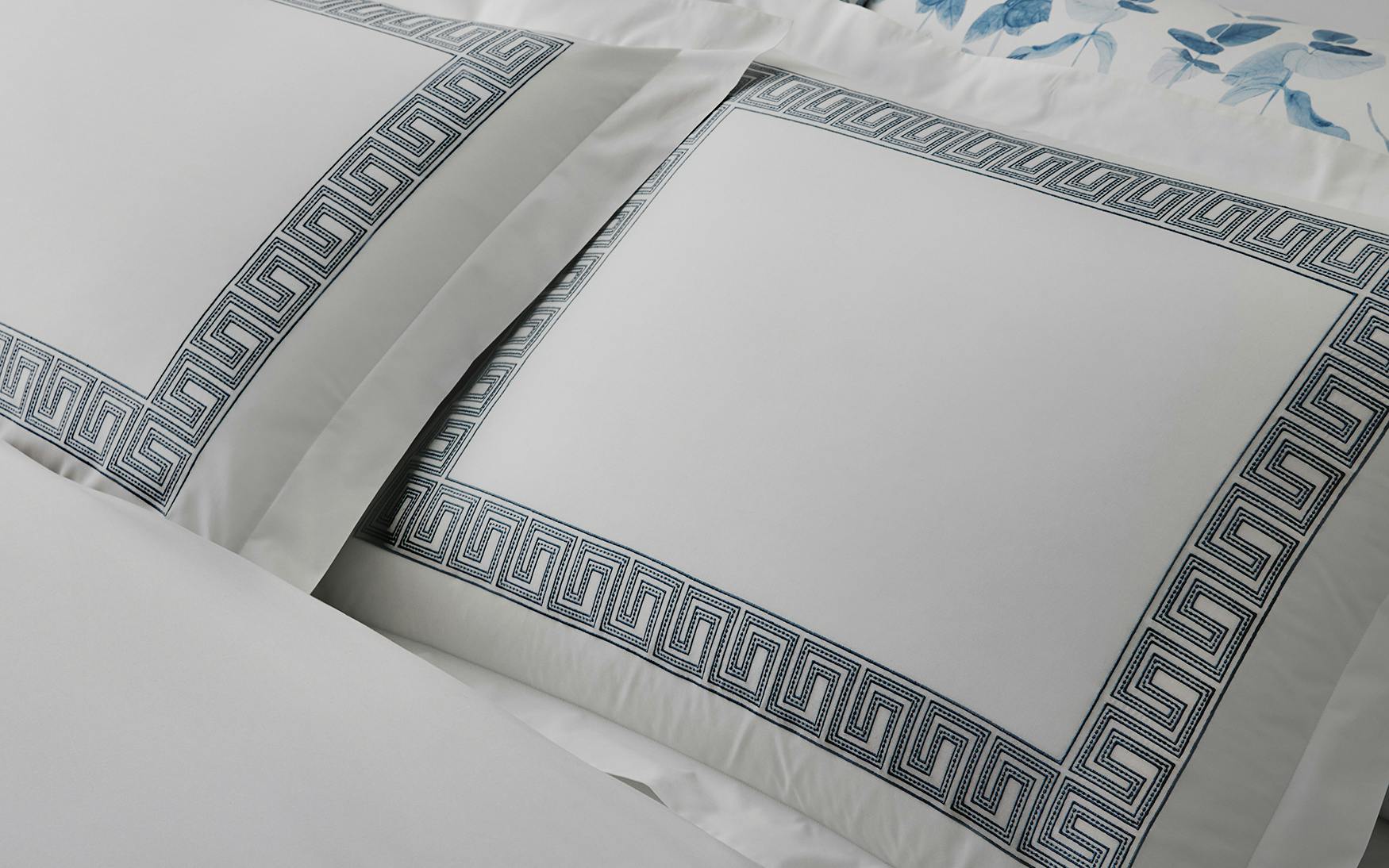 Inspired by an intricately beaded Schumacher tape, our boldly embroidered Ophelia collection embodies a traditional Greek key pattern with a bespoke sensibility. In 520 thread count Ceylon sheeting, it’s a playful, exuberant take on a traditional motif.