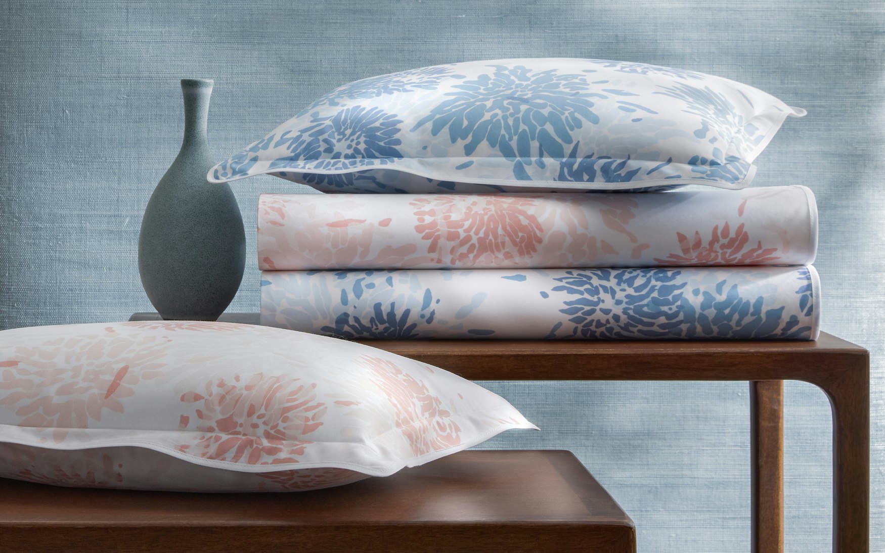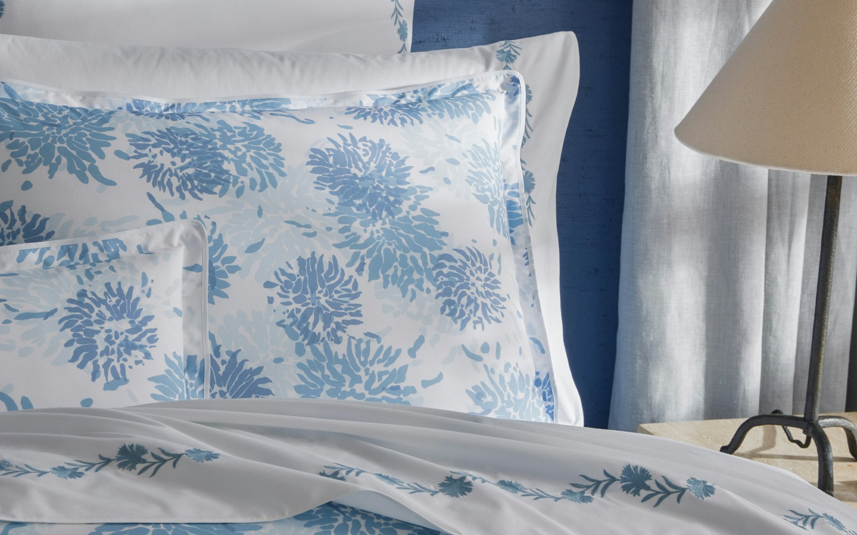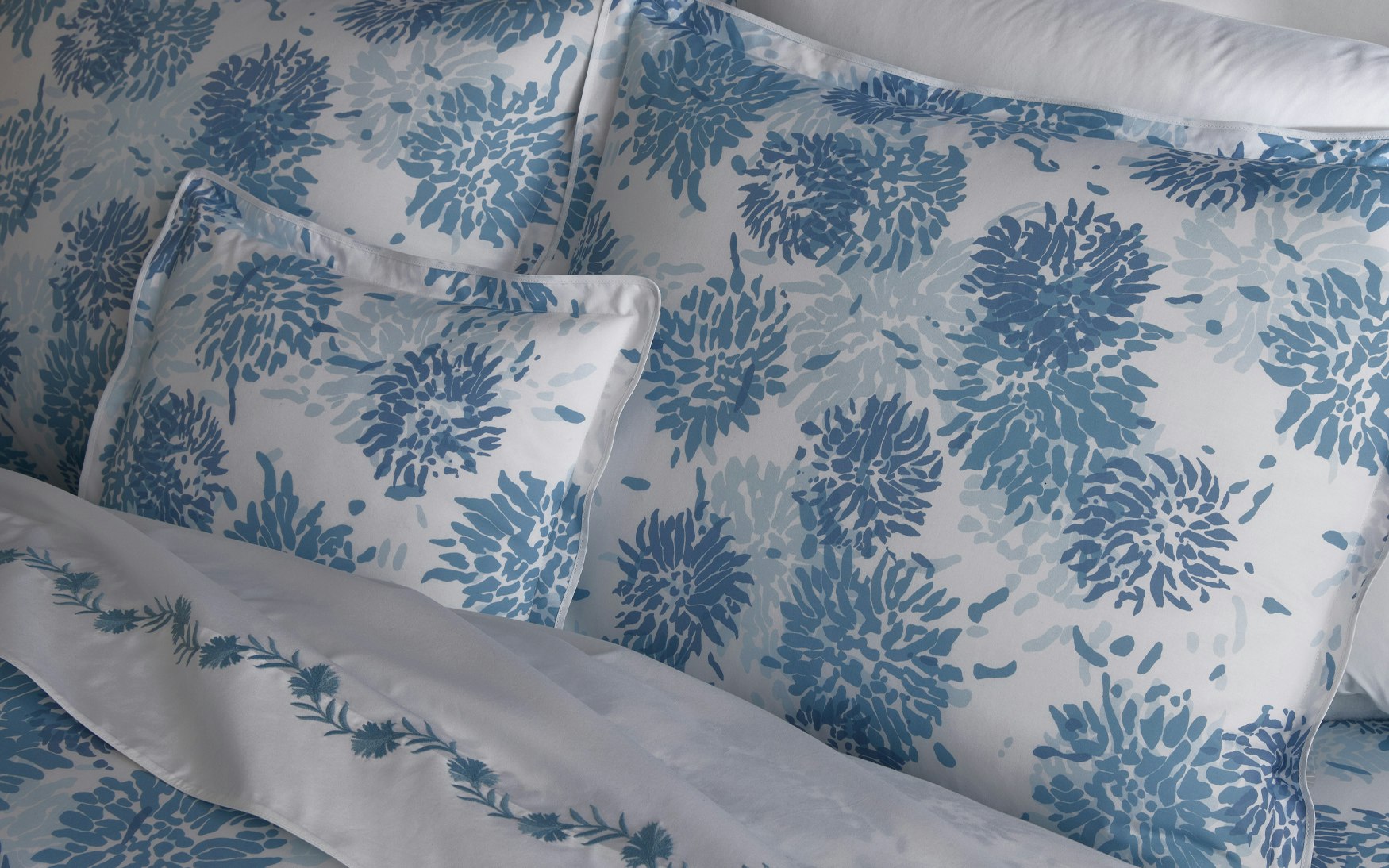 Chrysanthemum is a Matouk Tillett style inspired by one of Tillett Textiles's most iconic prints. Originally designed by DD Tillett and famously featured in Jacqueline Kennedy Onassis’s Hyannis Port home, this beautiful pattern on crisp Luca percale features a flowing floral motif and soft, painterly lines. It lends a graceful, romantic sensibility to the bed.