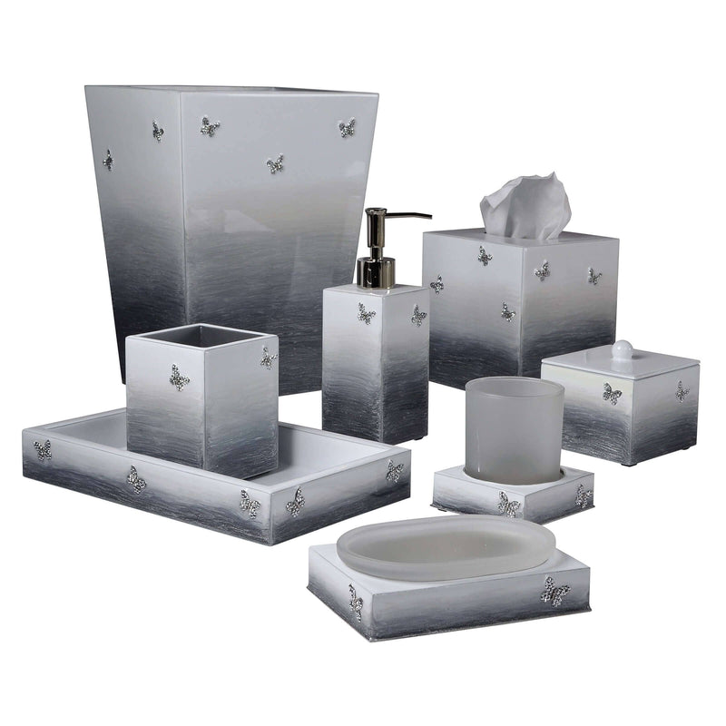 Artisans have crafted a soothing ombre effect accented with exquisite pave butterflies for a refreshing bathroom accent, featuring a natural gradation of ecru, putty, and mocha with gold trim. Each piece is custom made in our NYC studio. Please allow 4-5 weeks.