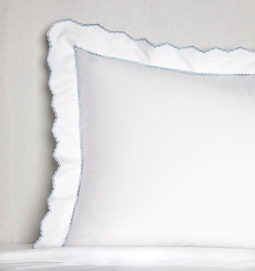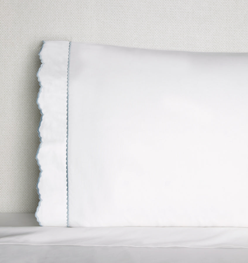 A fanciful update to the beloved Celeste, our best-selling percale for over 20 years, Pettine features embroidered scalloped edges and lined satin stitch border for a look of elevating ease and chic refinement. Beautiful Italian tailoring, supple drape, and remarkably smooth hand- feel define Pettine with the heritage craftsmanship
