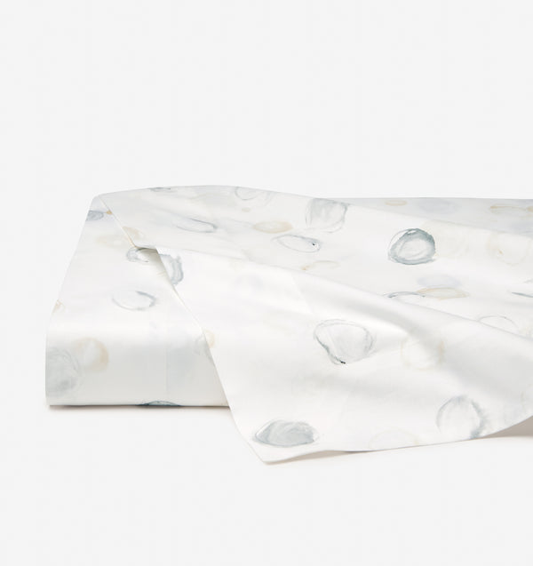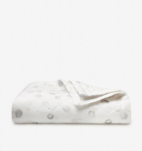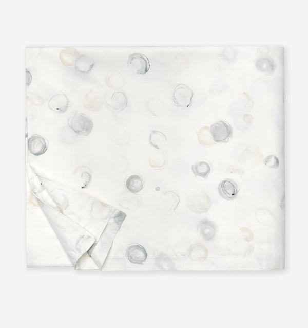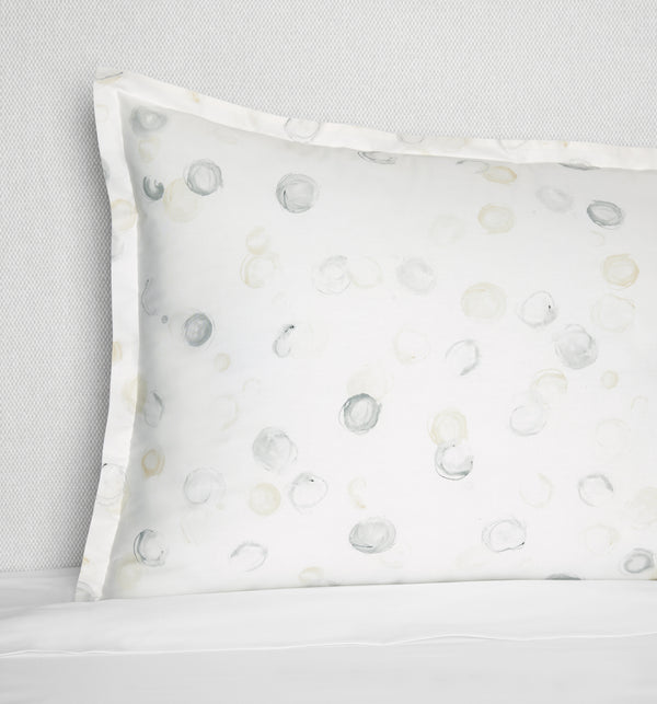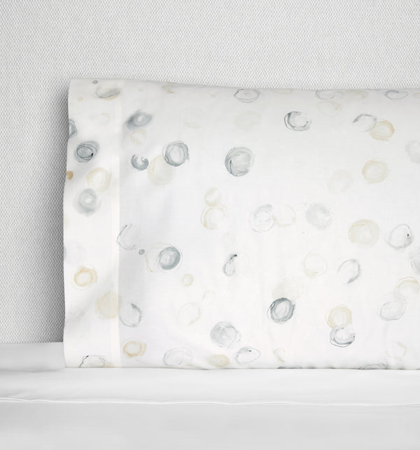 Brushed-on shades of grey and taupe create an all-over pattern on a Punti's indulgently soft and breathable percale base. The coordinating Squillo embroidered collection is tied together with two lines of grey and taupe, which form whimsical loops as they dance around the four sides. Together, the collections add a playful modernity to the classic polkadot, elevating the bedroom while infusing it with a subdued sprightliness.