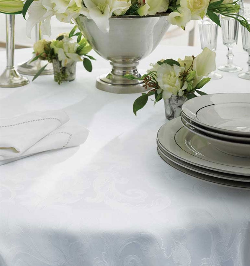Acanthus leaves are jacquard-woven onto fine, long-staple cotton for an elegant, all-over pattern. Available in bold and neutral colors, this tablecloth, napkin and placemat collection is perfect for any occasion.