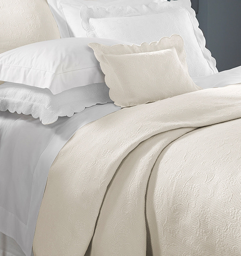 In the classic tradition of matelassé, a subtle raised pattern of flowers and vines is woven from the softest of cottons. Scalloped edges finish the sweet look on these coverlets and shams.