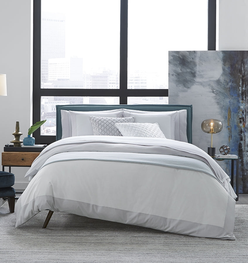 Casida is minimal and modern, creating an impact with its contrast color border in sateen appliqué along one side, and solid sateen on the reverse for multiple ways to style. Knife edge on seams create a clean, tailored silhouette.