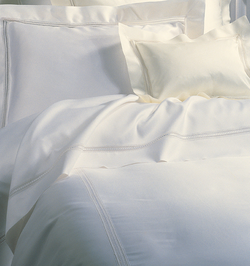To create the beauty that is Diamante, a macramé lace inset is threaded through its center with a thin, satin ribbon that frames the border of our luxuriously sleek sateen made of extra-long staple cotton.