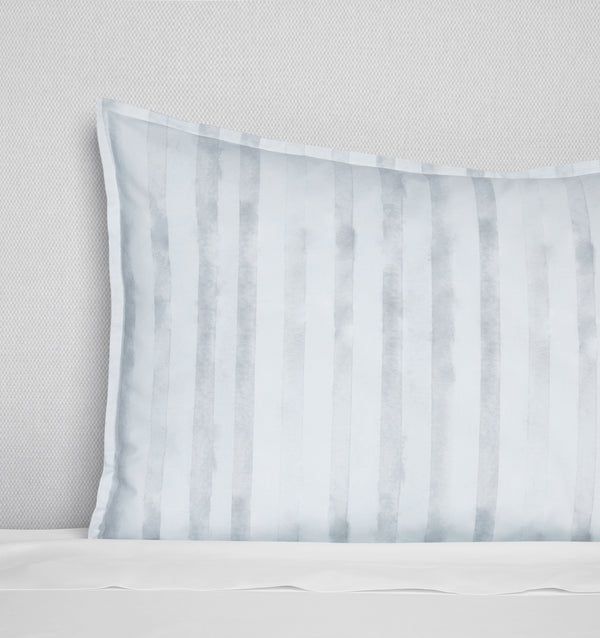 An all-over faded watercolor stripe adorns Kricia's Italian-woven long-staple cotton percale, evoking the soft, sundrenched allure of cabana fabrics. In a lunar palette of blue-gray, each subtle line flows with a painterly grace, while mini flanges add a refined edge to this serene, dreamlike bedding.