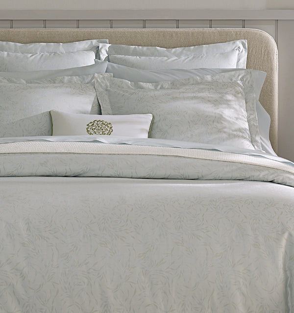 Palm tree fronds swaying in a gentle sea breeze. This tranquil scene inspires the serene beauty of Selini. Crafted from Italian-woven long-staple cotton in a luminous sateen jacquard weave, its soft silver sage palette evokes the quiet elegance of tropical retreats, where nature's calming presence is woven into every leaf.