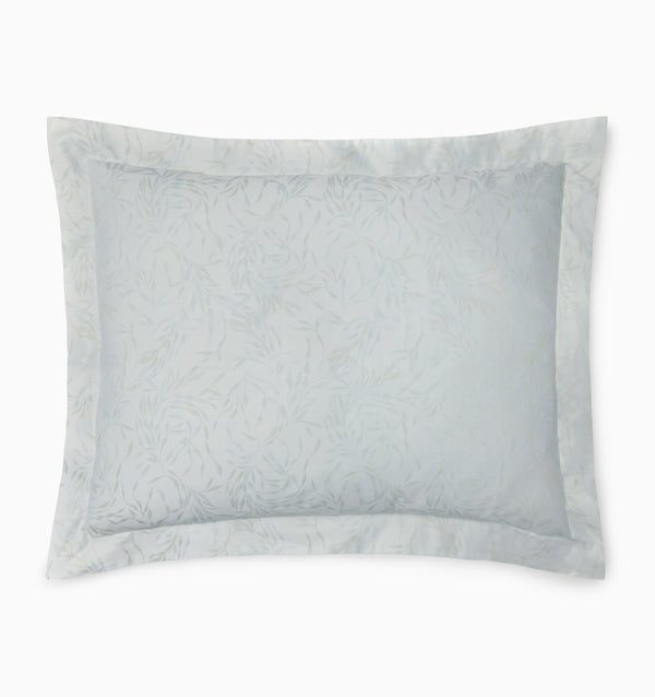 Palm tree fronds swaying in a gentle sea breeze. This tranquil scene inspires the serene beauty of Selini. Crafted from Italian-woven long-staple cotton in a luminous sateen jacquard weave, its soft silver sage palette evokes the quiet elegance of tropical retreats, where nature's calming presence is woven into every leaf.