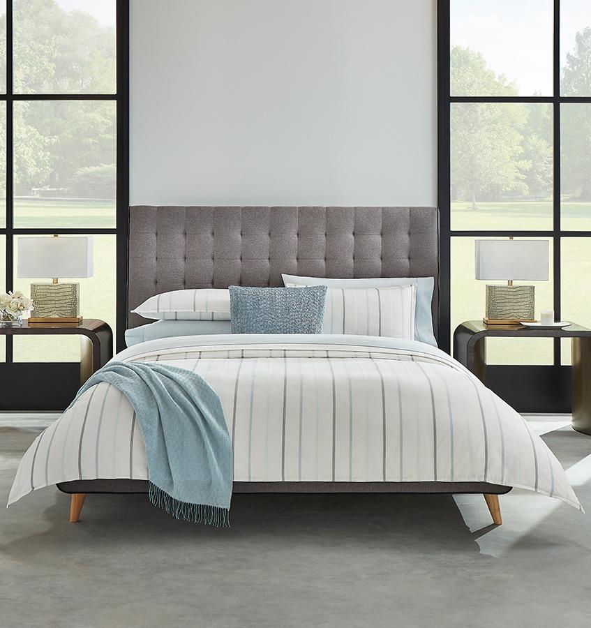 A handsome, coastal-inspired bed featuring alternating yarn dyed stripes of soothing blue, white and grey, Striscia is woven with a snowy-white sateen base that naturally imparts a slight sheen. Mini flanges and a plain hem complete the clean, modern look.