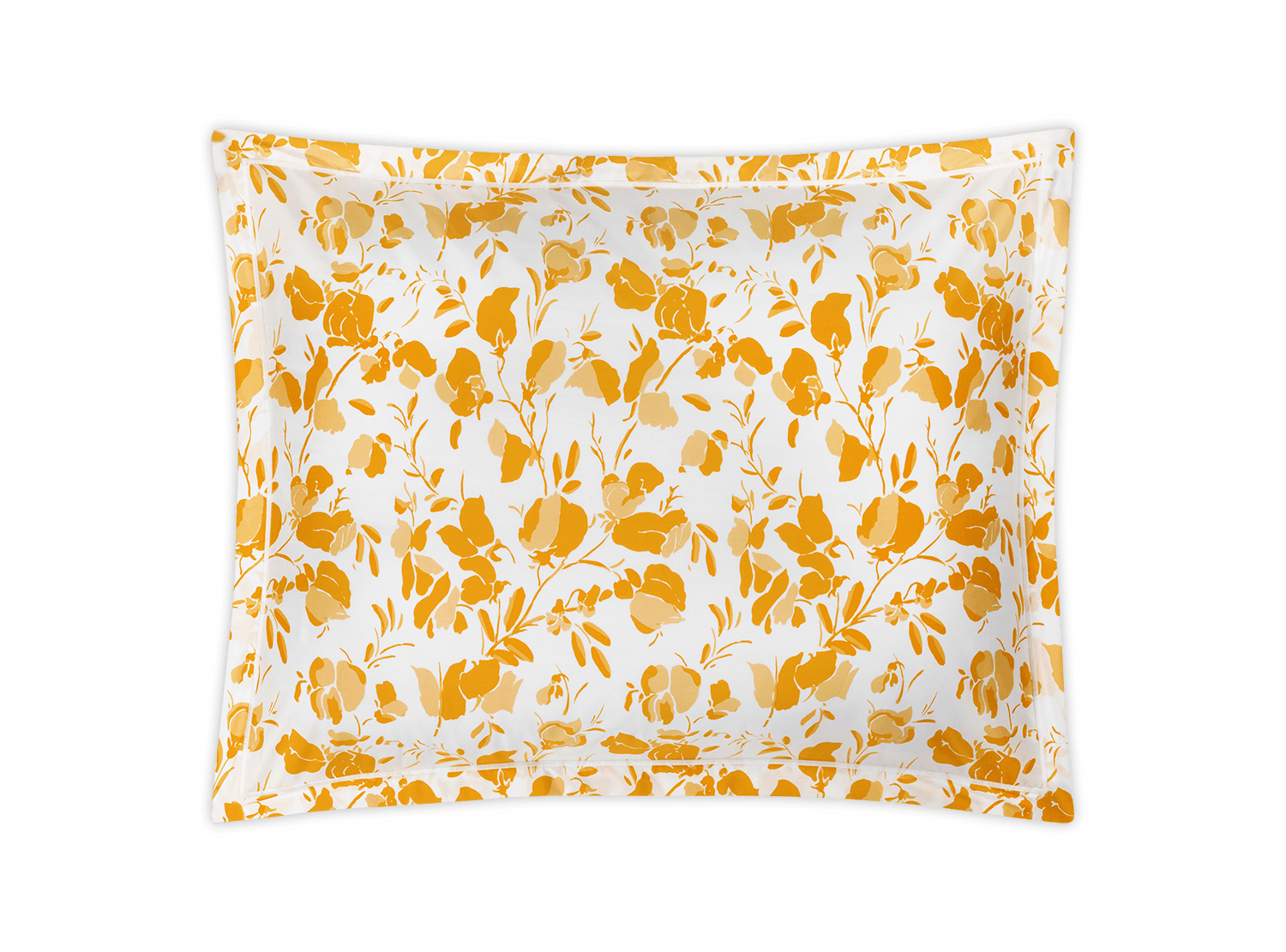 Based on a vintage Parisian find from a similar era as our Margot collection, Alexandra combines a bold approach to scale with fresh, livable colors. Its floral print—on white 500 thread count Luca Egyptian cotton percale finished with an elegant satin stitch—creates a playful look for the whole bed, or it can be used more sparingly as a beautiful accent on shams or sheeting.