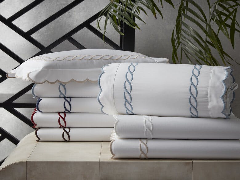 Delving into the Matouk archive, Classic Chain Scallop reintroduces our signature chain motif in combination with our timeless scalloped edge. It is crafted on Milano, our crisp and cool 600 thread count Egyptian cotton percale, and specially finished with a return embroidery detail on the flat sheet. Classic Chain Scallop is both charming and chic.