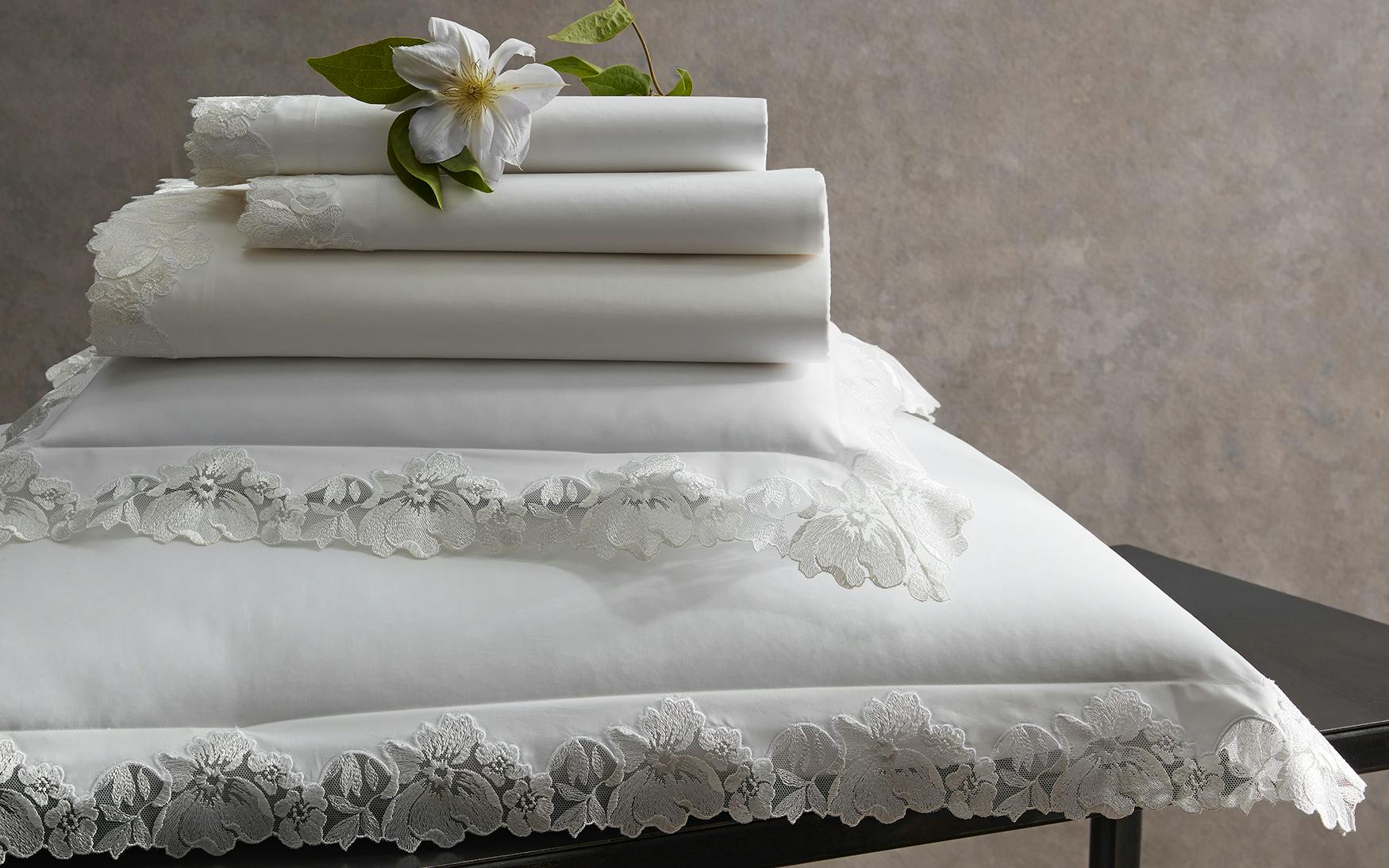 Virginia looks back to our early years importing lace, a special nod to Matouk's 90th anniversary. For this couture collection, an archive-inspired Swiss lace is cut and placed by hand on our supremely luxurious, 1000 thread count Gatsby Giza Egyptian cotton percale.